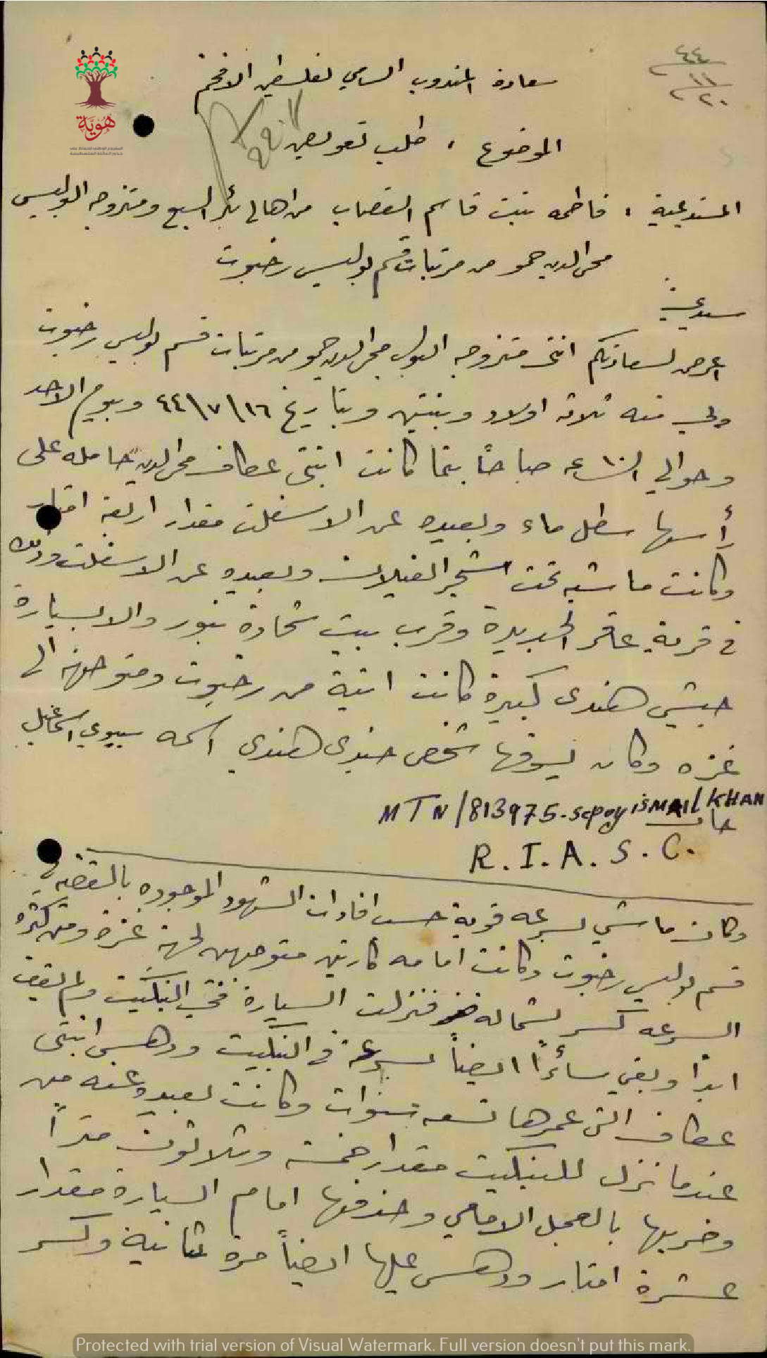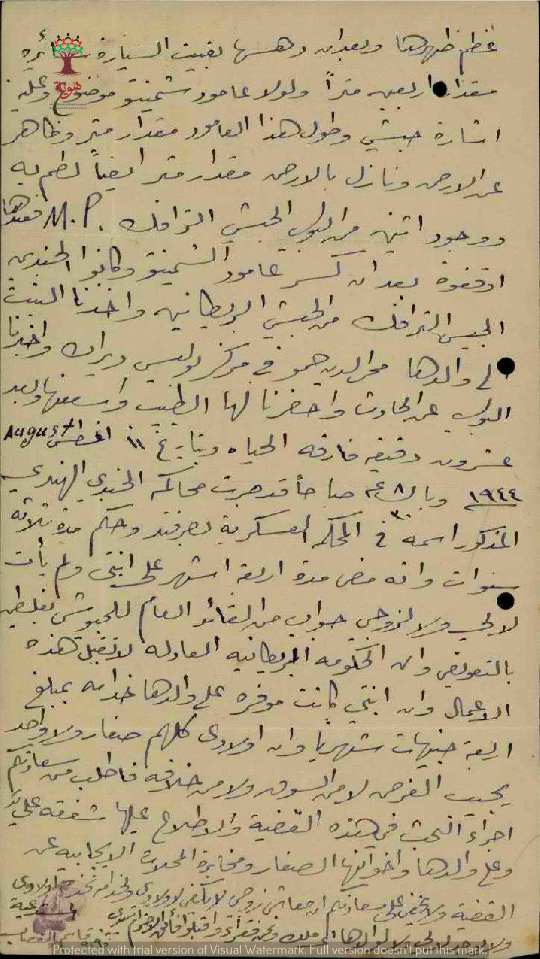 رسالة من فاطمة قاسم القصاب الى المندوب السامي تطلب فيها تعويضا عن دهس سيارة عسكر ية لابنتها وتبين فيها تفاصيل الحادثة والأضرار الناجمة عنها