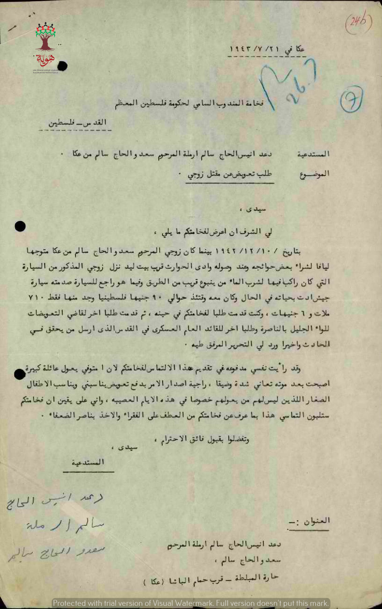 مجموعة وثائق بخصوص طلب دعد أنيس سالم تعويض عن وفاة زوجها سعدو حاج سالم إثر حادثة دهس بواسطة سيارة عسكرية ورفض طلبها للتعويض.