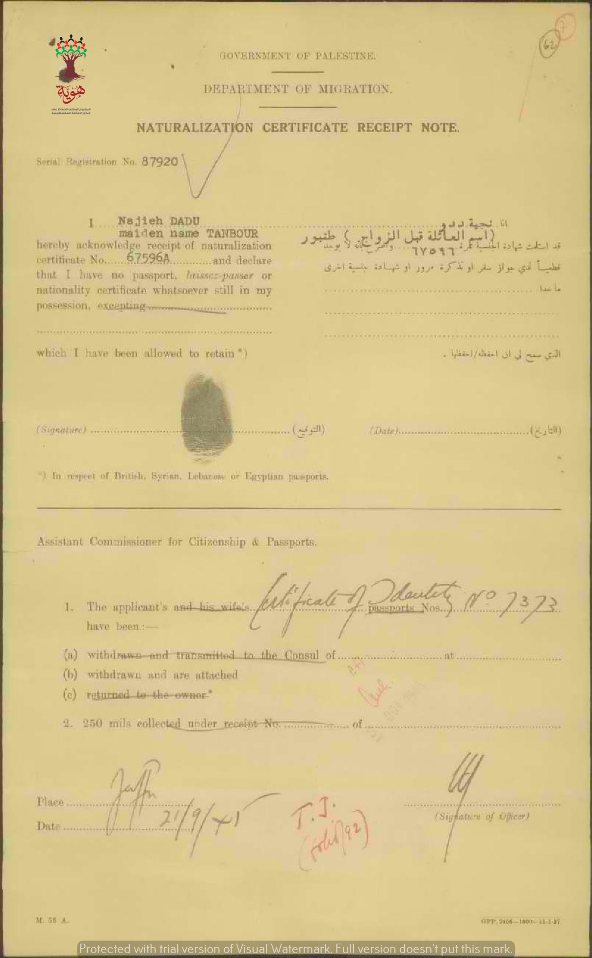 إيصال موقع من ناجية طنبور ددو باستلام شهادة الجنسية الفلسطينية
