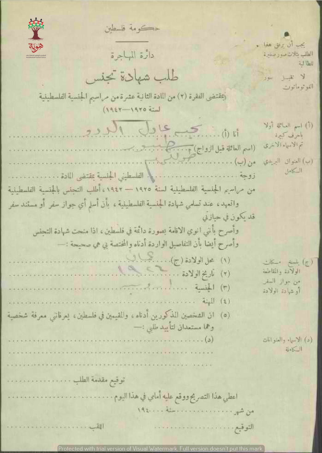 طلب شهادة الجنسية الفلسطينية-ناجية طنبور الددو-طولكرم/عمان