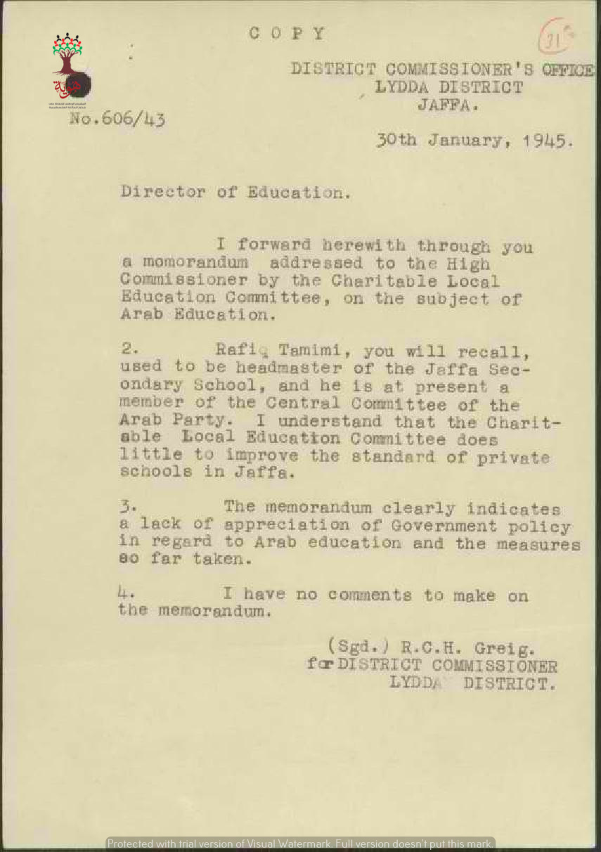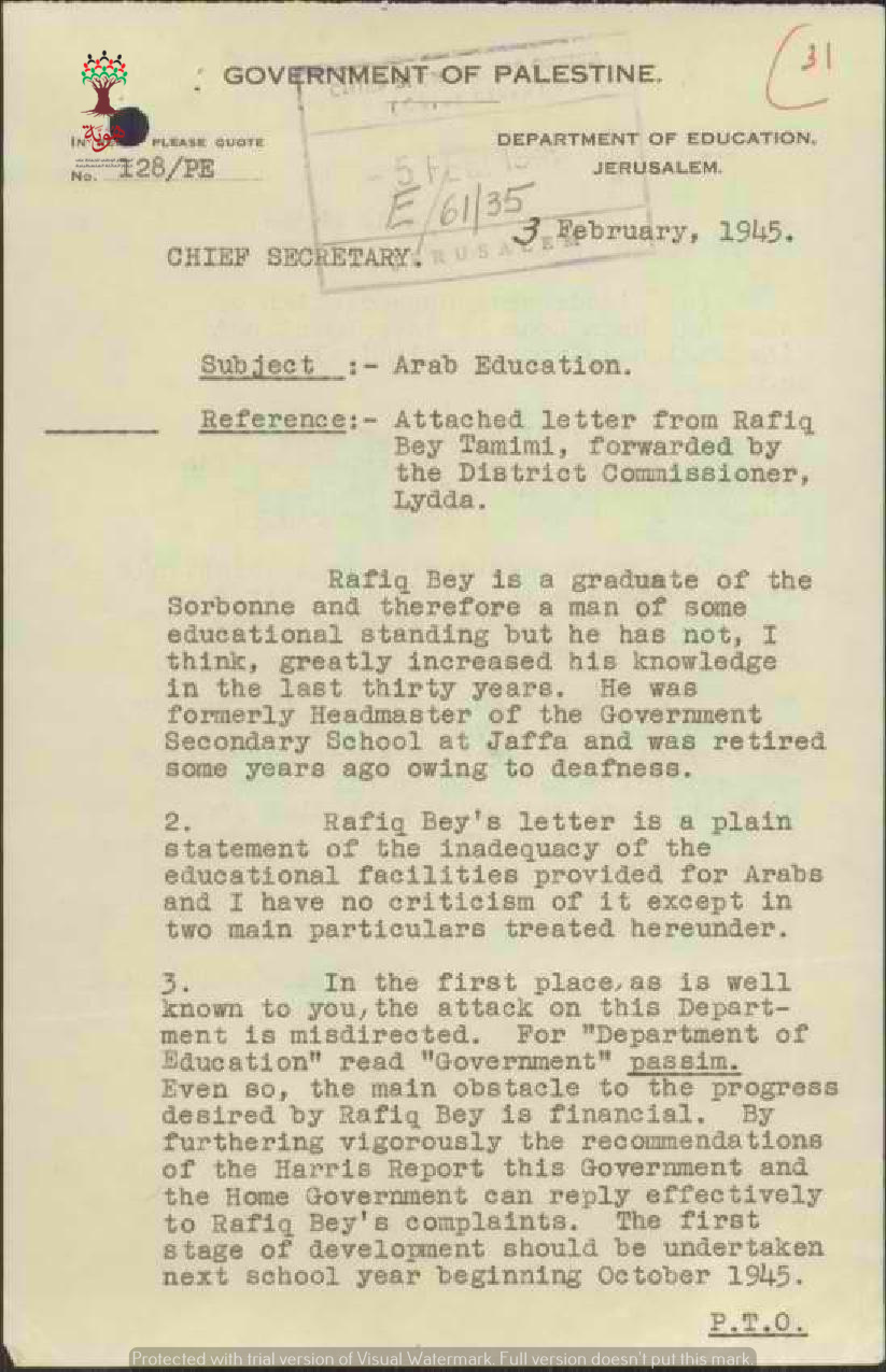 رسائل من مدير المعارف الى رئيس السكرتارية بخصوص رسالة توفيق التميمي المعترض فيها على التعليم في فلسطين
