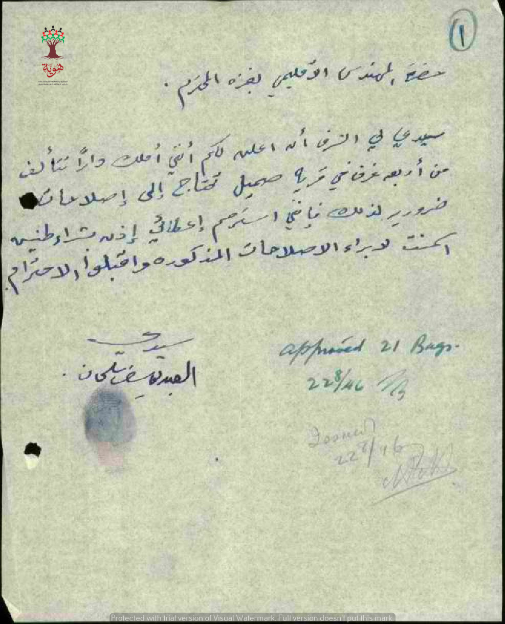 رسالة من يوسف سلمان الى المهندس الإقليمي في غزة يطلب فيها إذن لإصلاح منزله /صميل-غزة