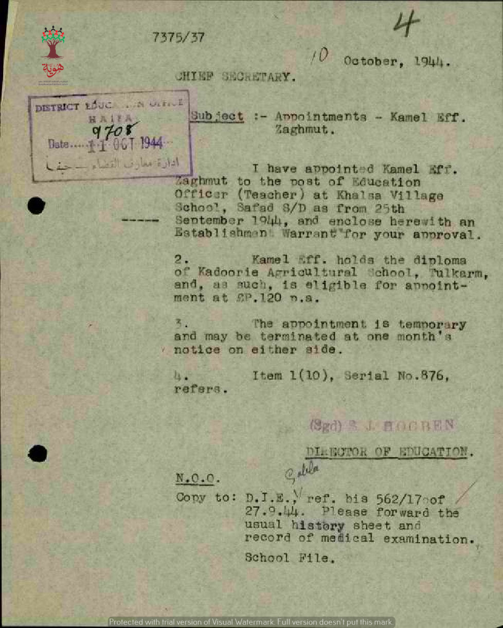 رسالة من مدير المعارف الى رئيس السكرتارية بخصوص تعيين المعلم كامل زغموت في مدرسة ذكور الخالصة.