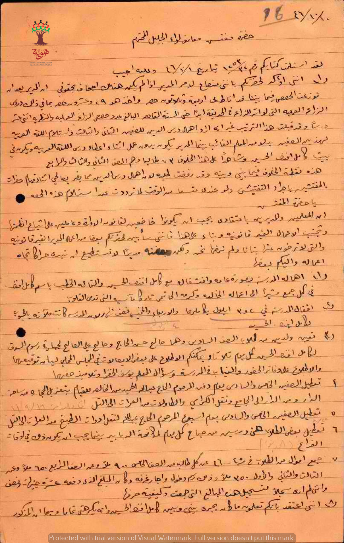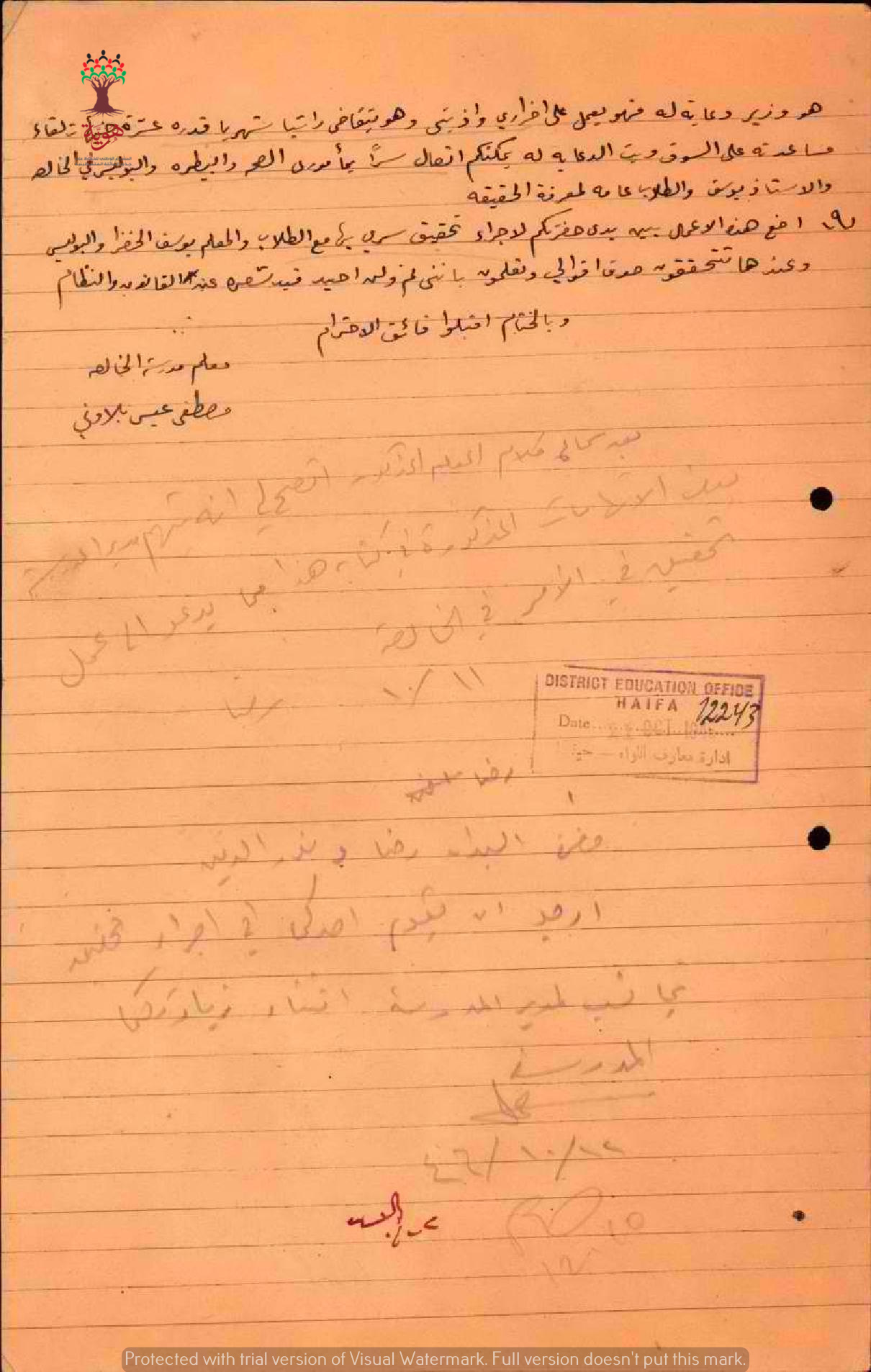 مجموعة رسائل بخصوص الخلاف بين المعلم كامل زغموت والمعلم مصطفى عيسى بلاوني من حيث توزيع الحصص وتغيب المدير عن المدرسة وغيرها.