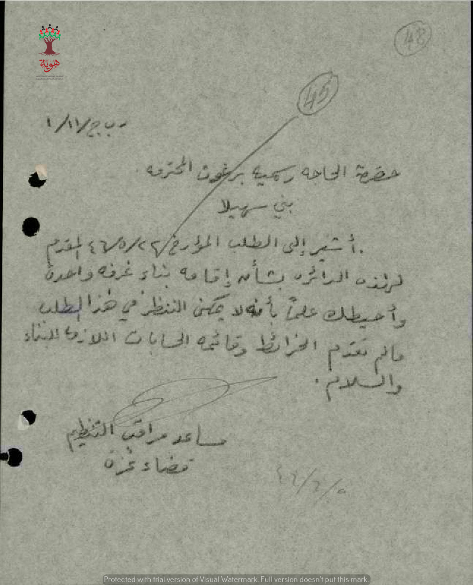 رفض طلب البناء ل رسمية برغوث بتاريخ 22-5-1945 حتى يقدم الخرائط والحسابات المطلوبة.