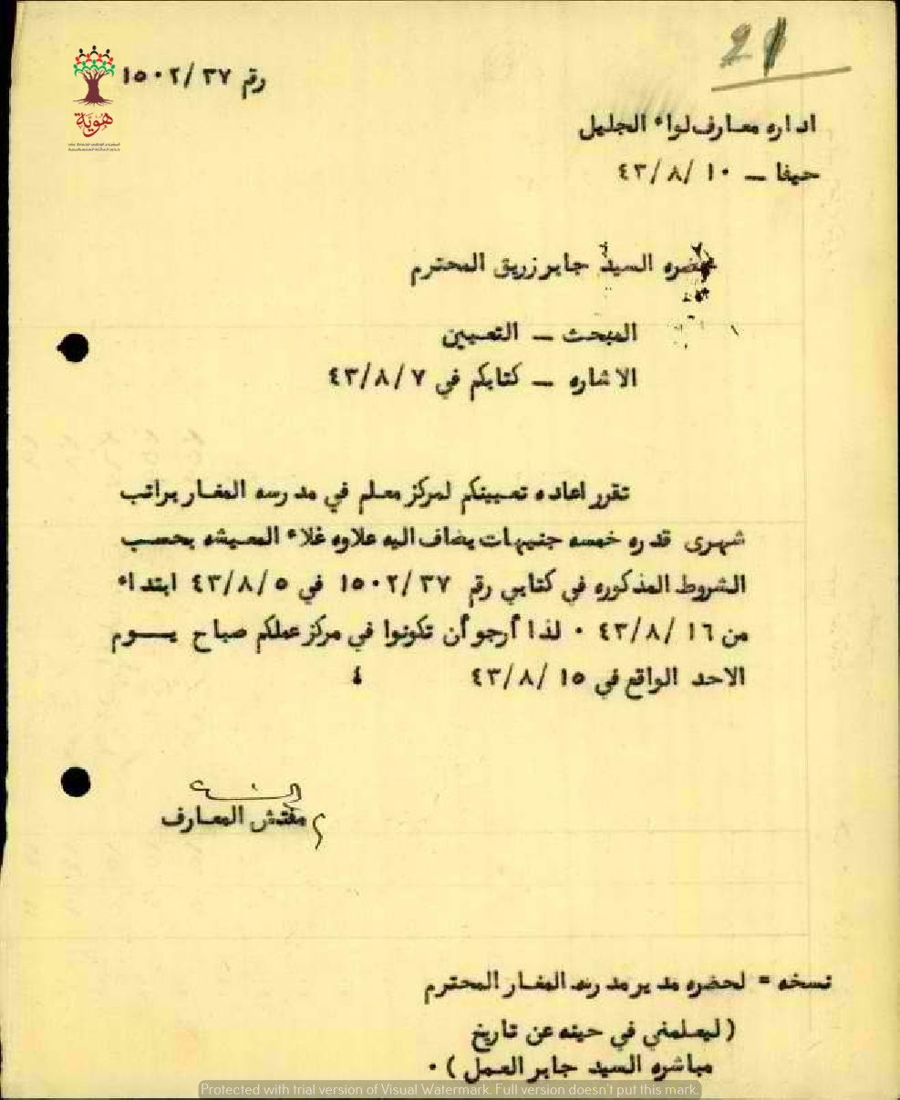 تعيين المعلم جابر زريق كمعلم غير رسمي في مدرسة المغار الأميرية