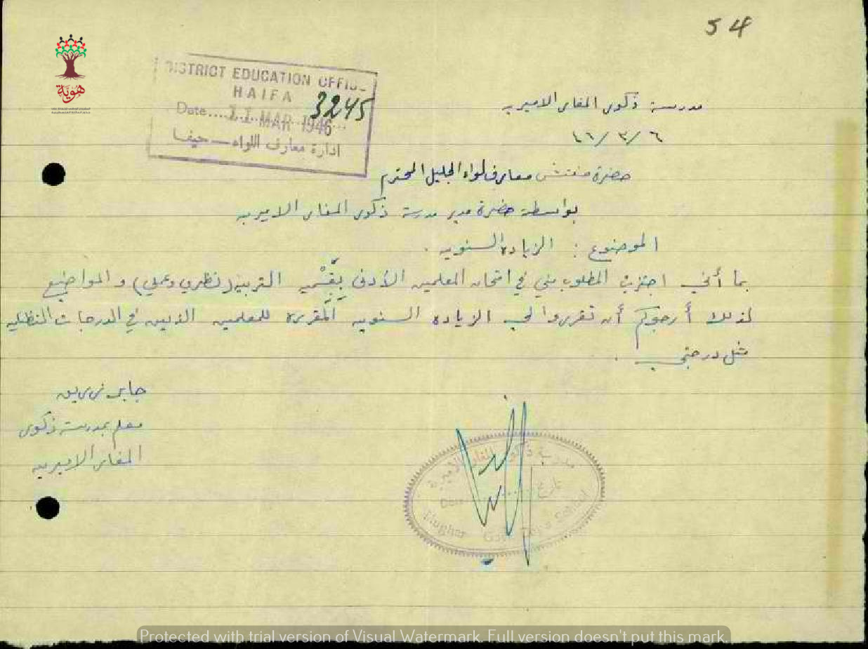 رسالة من المعلم جابر زريق الى مفتش المعارف يطلب فيها زيادة راتبه السنوية