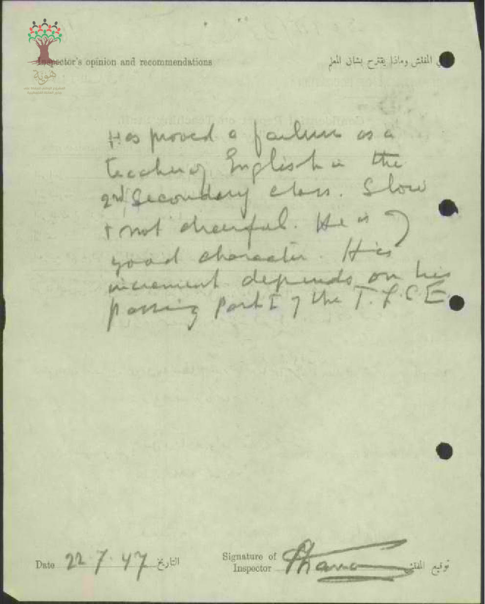 تقارير تفصيلية عن أداء المعلم جاد علي فياض في مدرسة طبريا