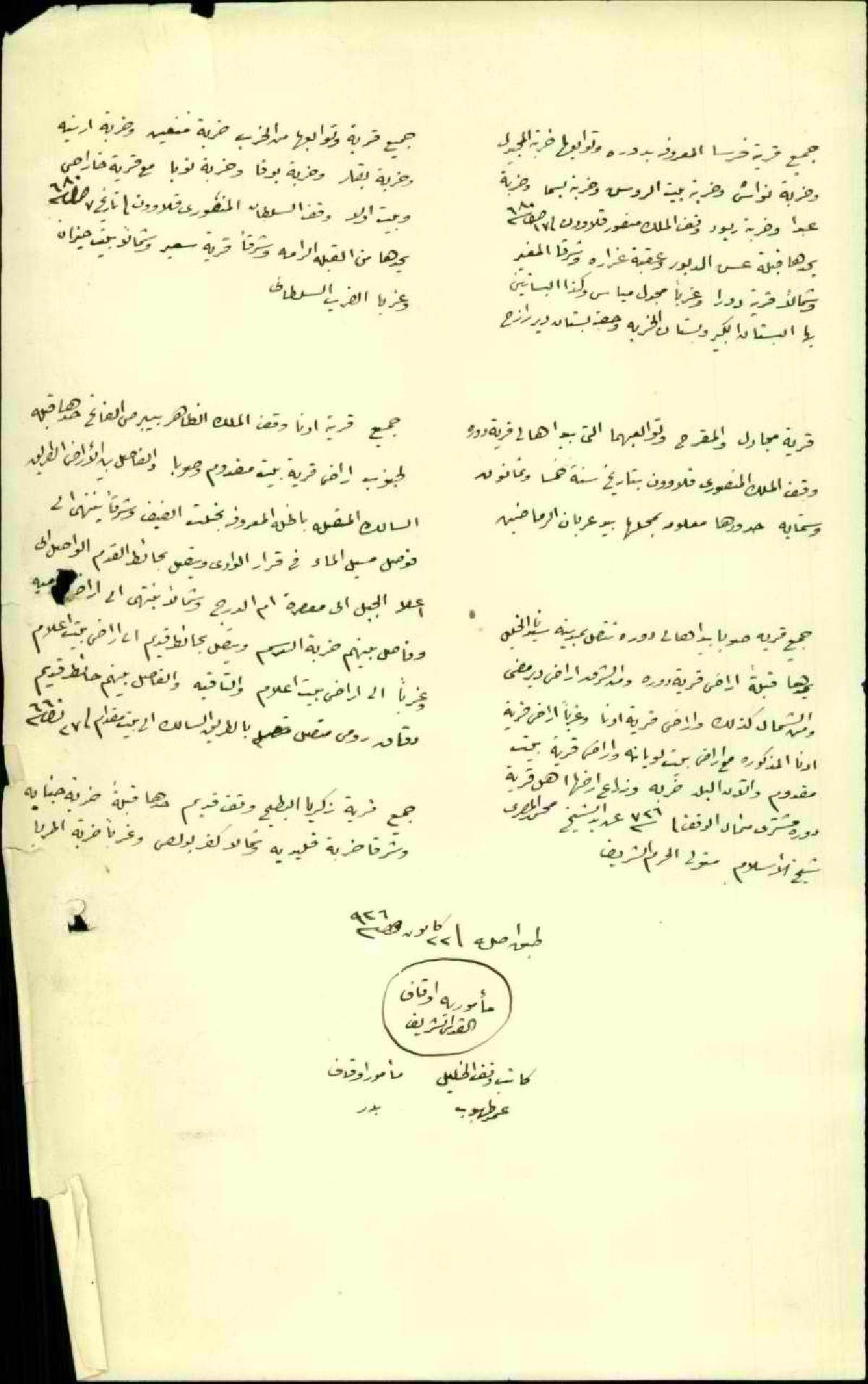 وثيقة من طرف كاتب وقف الخليل يوضح فيها تفاصيل أراضي الوقف في دورة وزكريا