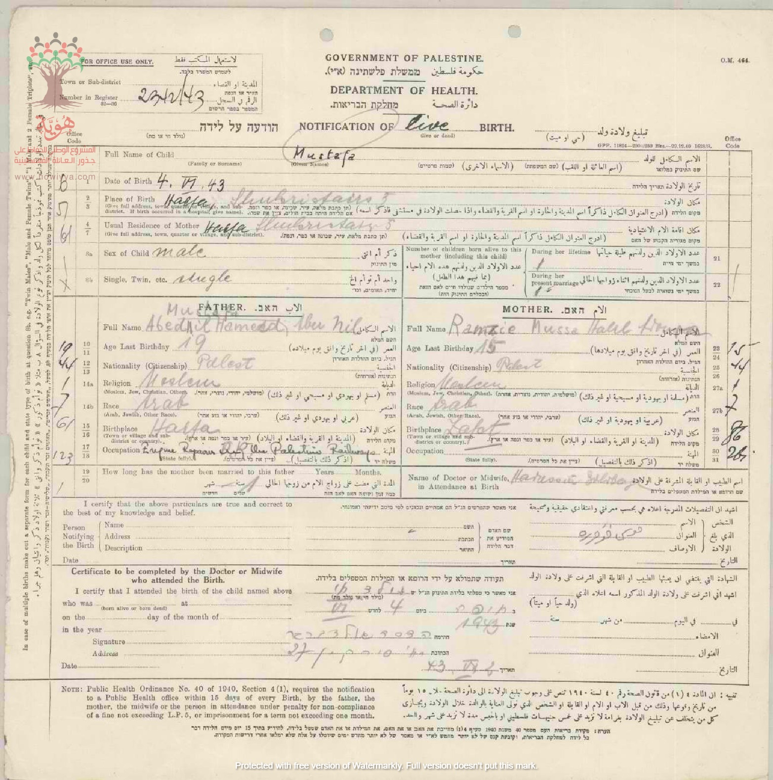 شهادة ميلاد مصطفى عبد الحميد ابو نيل - حيفا