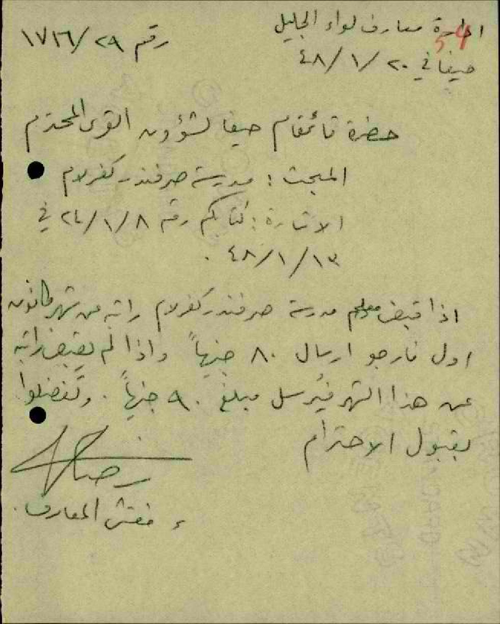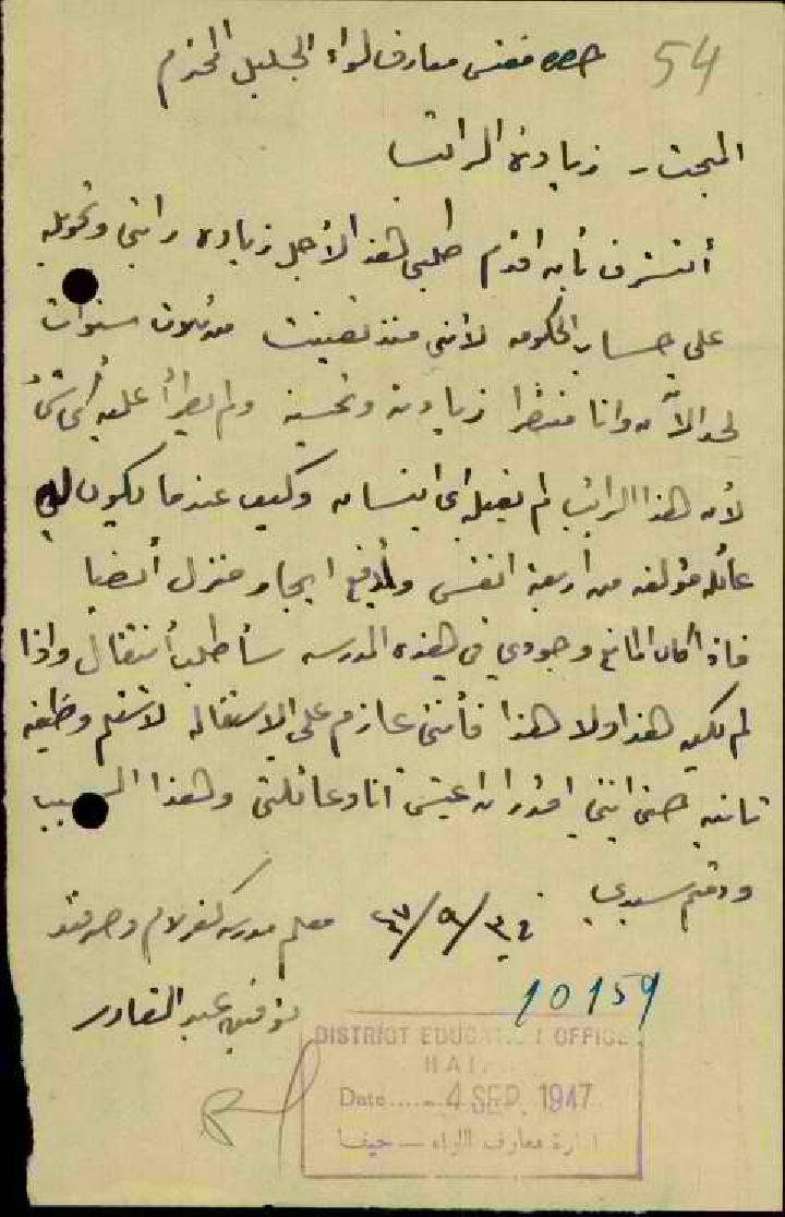 أوراق تتعلق بدفع راتب المعلم توفيق عبد القادر وطلب زيادة الراتب