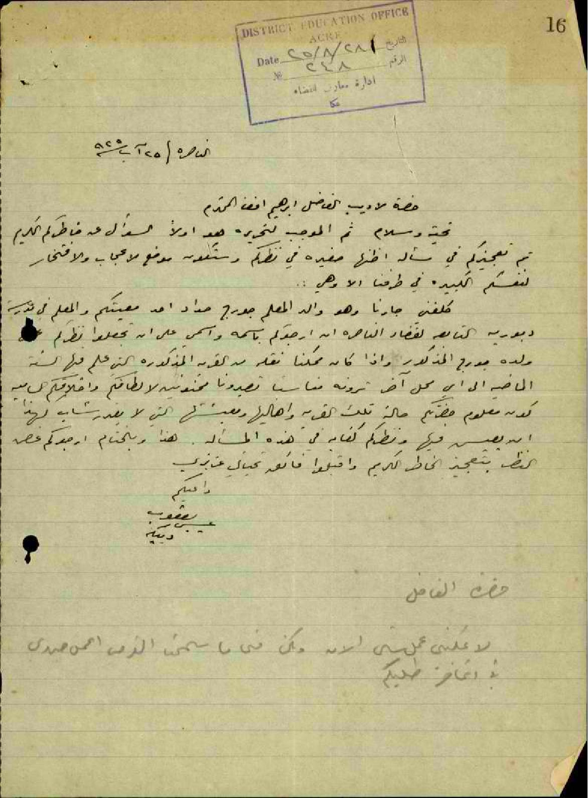 رسالة من عيسى يعقوب دبيكة إلى مفتش المعارف يطلب منه نقل المعلم جورج حداد إلى مكان آخر بناء على رغبته