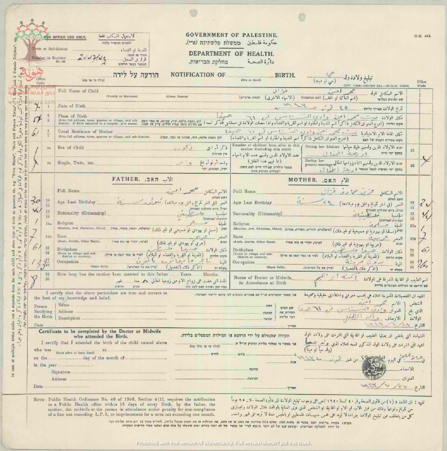 شهادة ميلاد فؤاد محمد الامين - حيفا