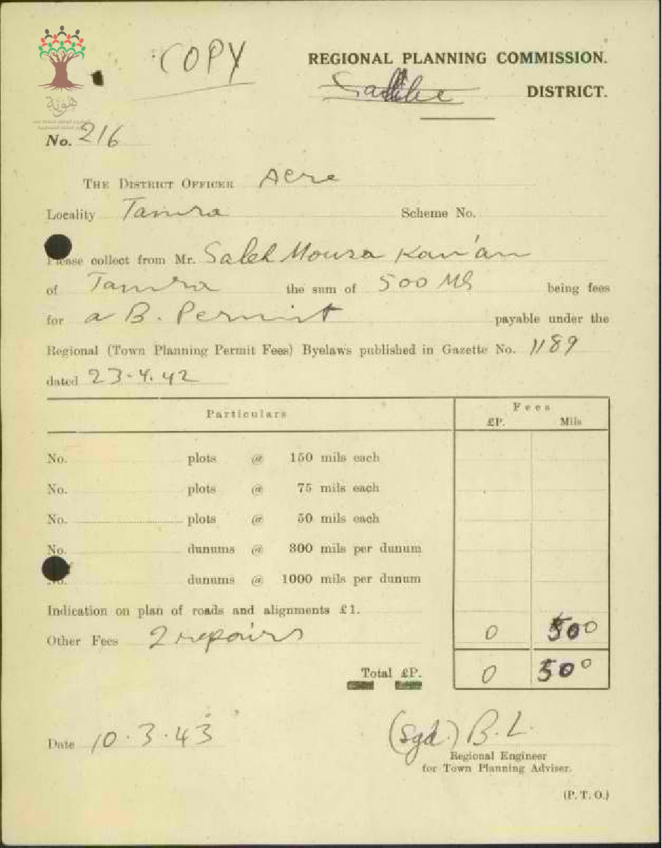 طلب مواد بناء لصالح صالح موسى كنعان/طمرة