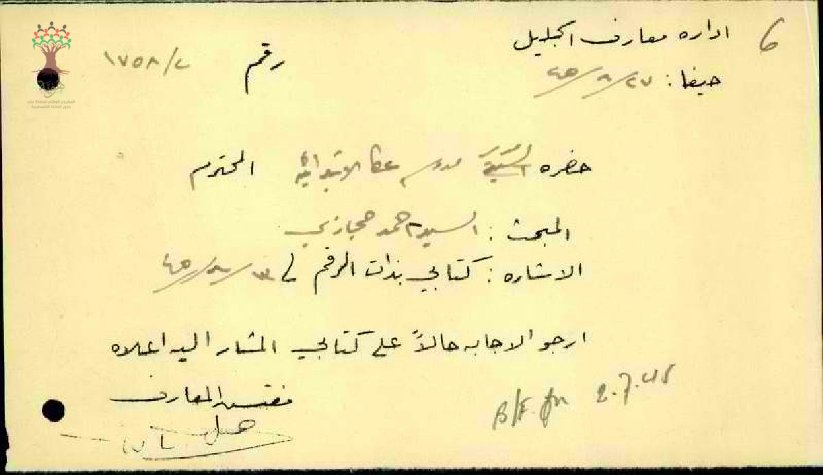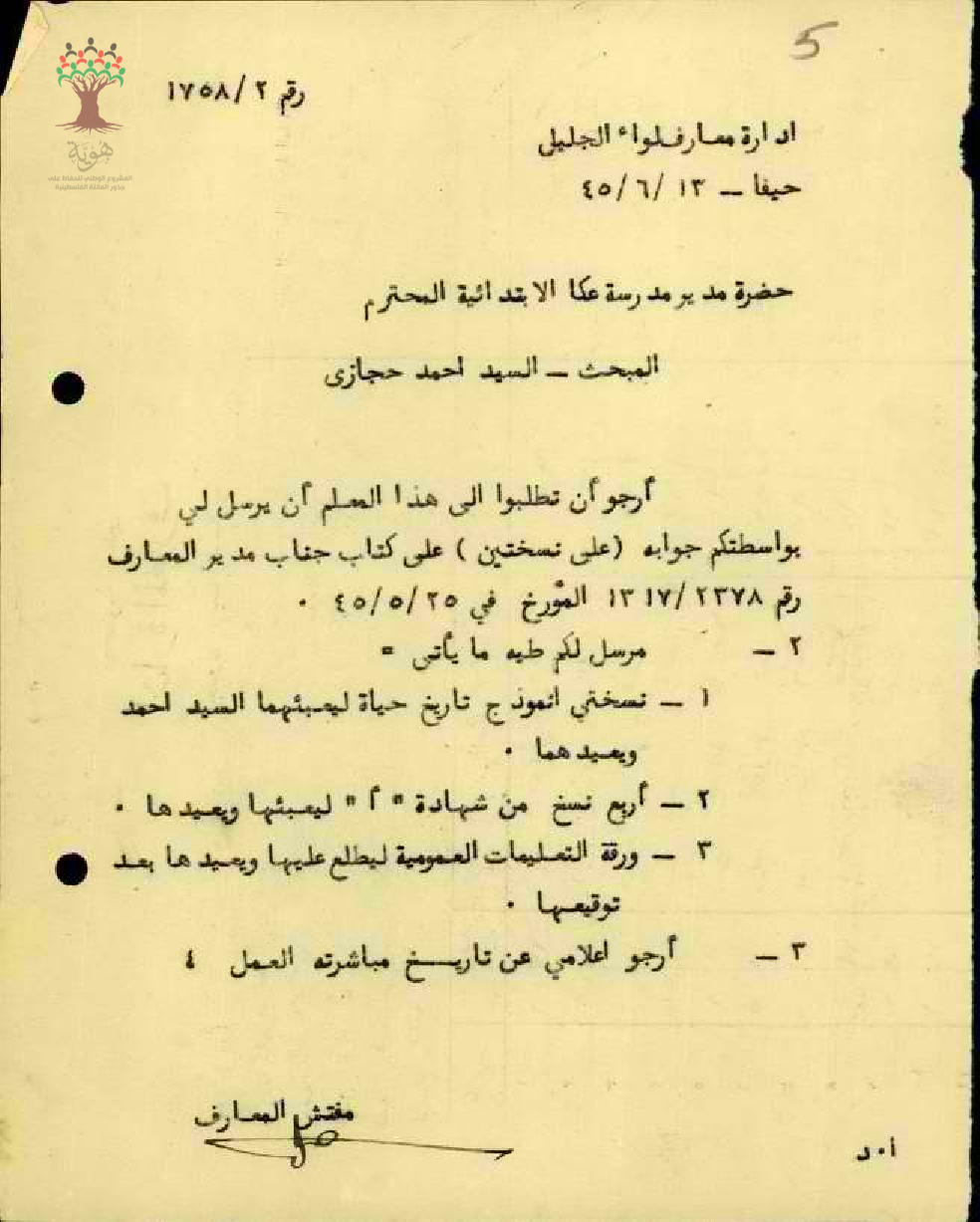 رسالة من مفتش المعارف إلى مدير مدرسة عكا يطلب من المعلم أحمد حجازي ارسال أوراق تتعلق بتعيينه