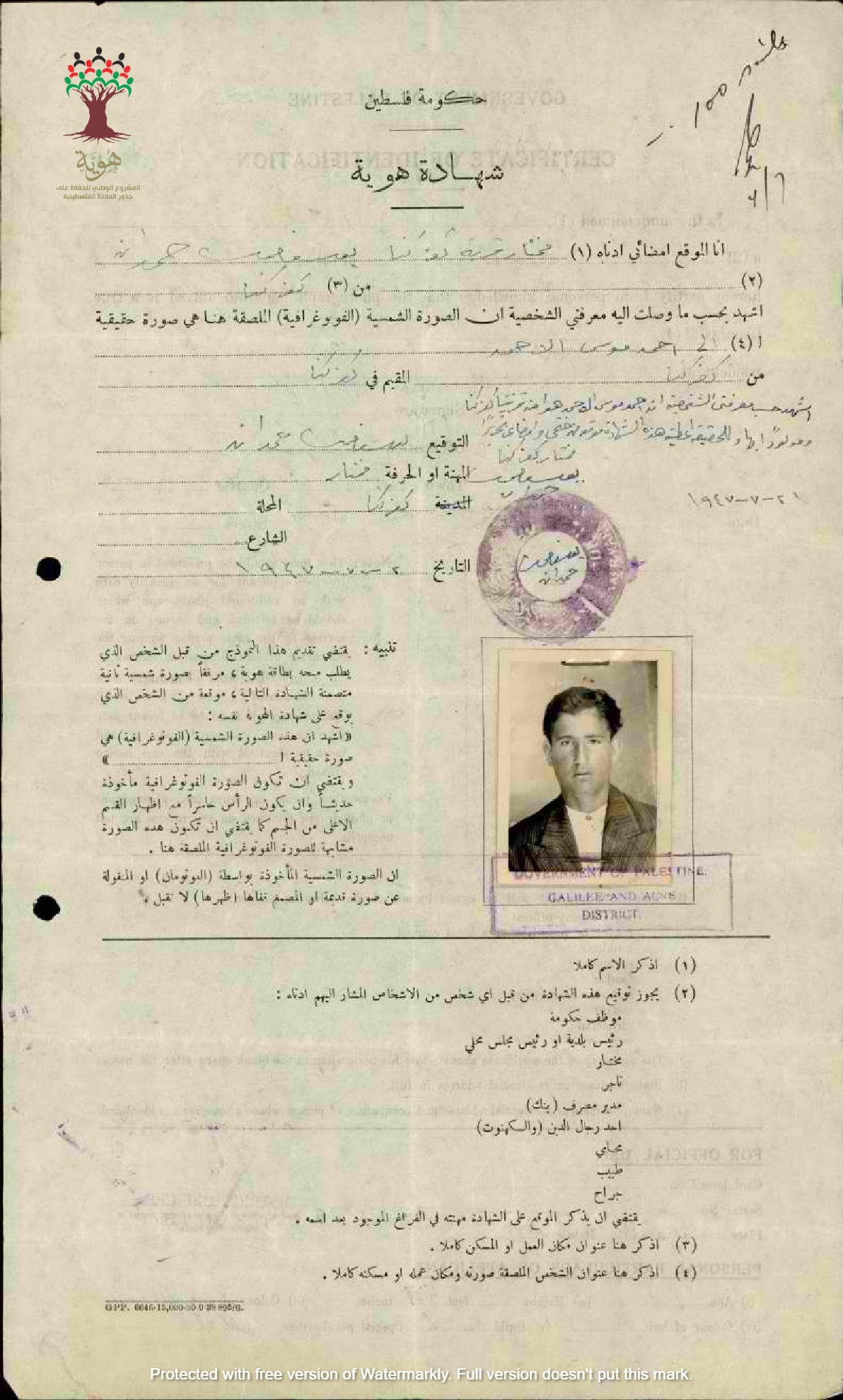 شهادة هوية احمد موسى الاحمد - كفركنا بتوقيع المختار يوسف حمدان