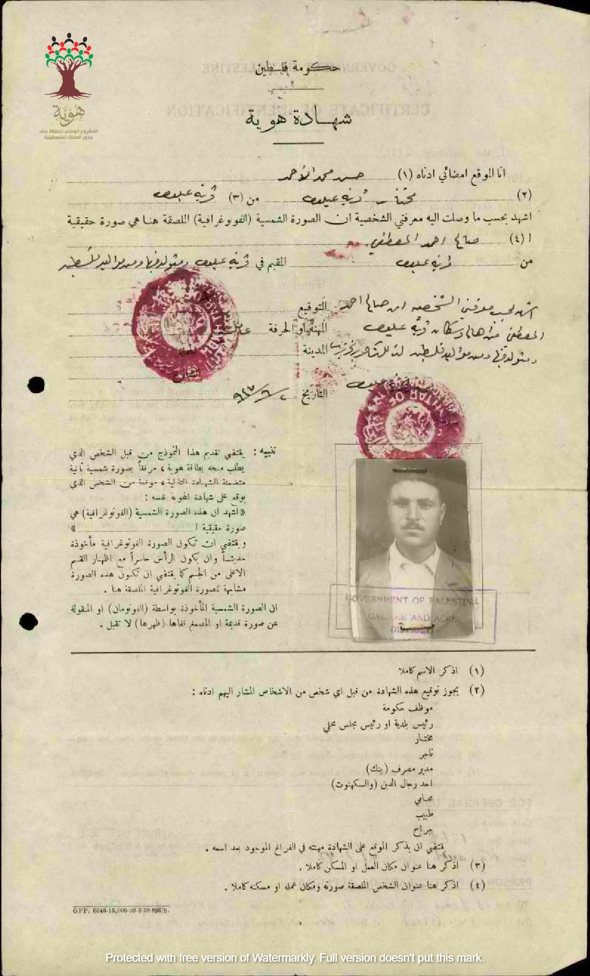شهادة هوية صالح المصطفى - عيلوط بشهادة المختار حسن الأحمد عام 1947