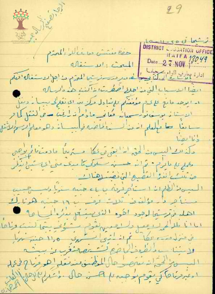 رسالة من المعلم أحمد حجازي إلى مفتش المعارف يبحث معه أمر الاستقالة