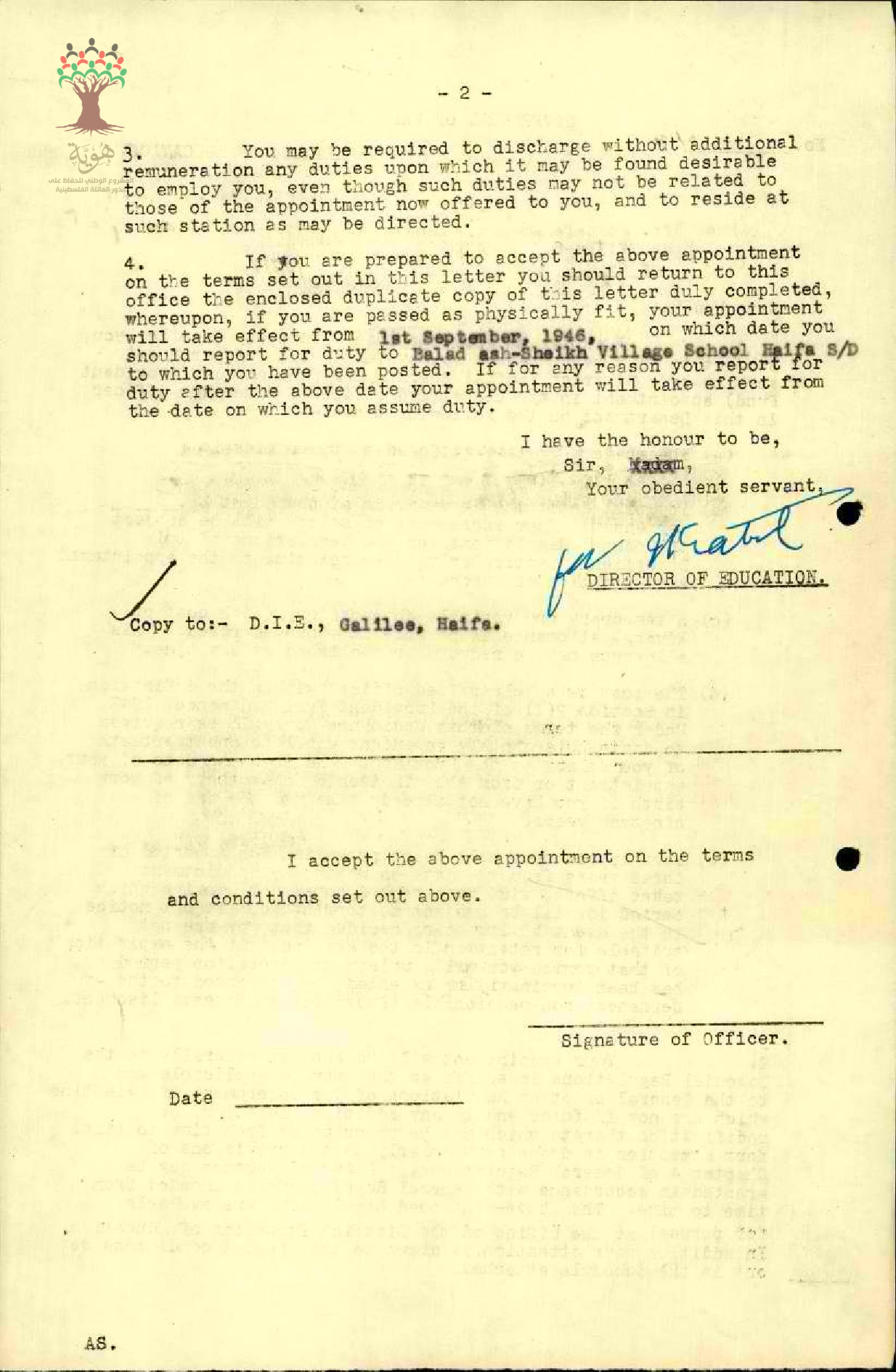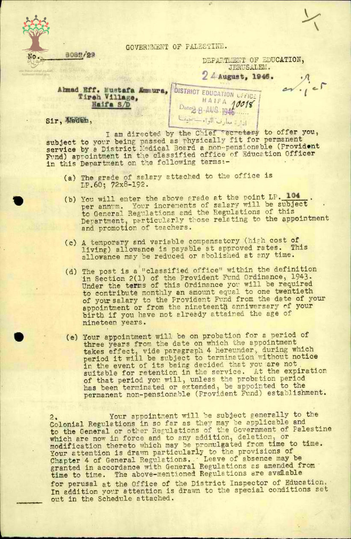 رسالة تعيين للمعلم أحمد مصطفى عمورة في إدارة المعارف