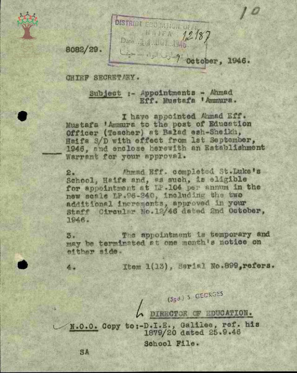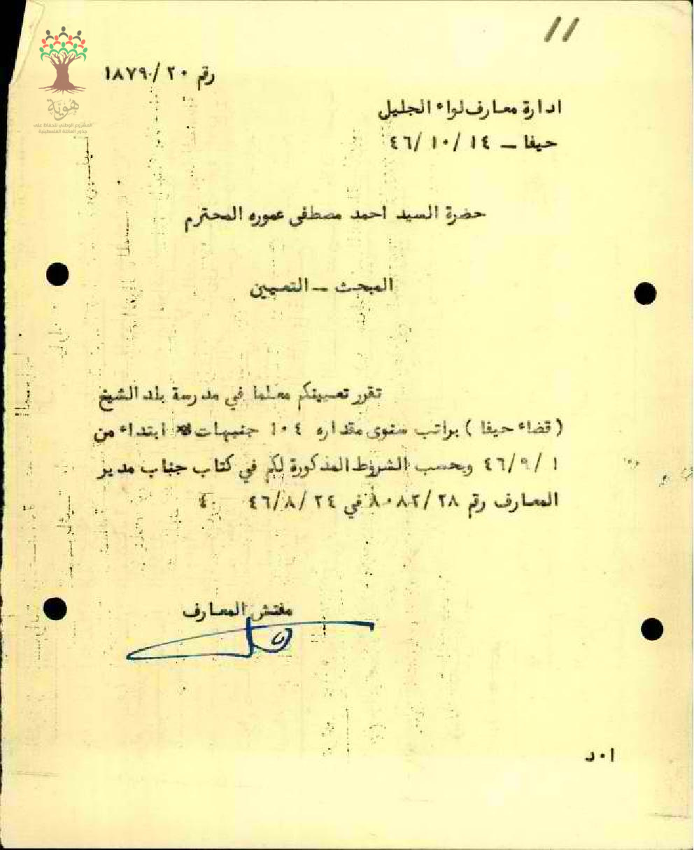 رسالة تعيين للمعلم أحمد مصطفى عمورة في مدرسة بلد الشيخ