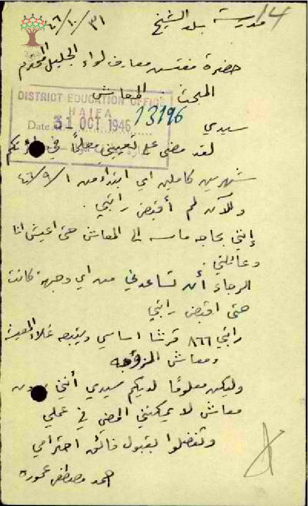 رسالة من المعلم أحمد مصطفى عمورة إلى مفتش المعارف يطلب منه دفع راتب الشهرين الذي عمل فيهما