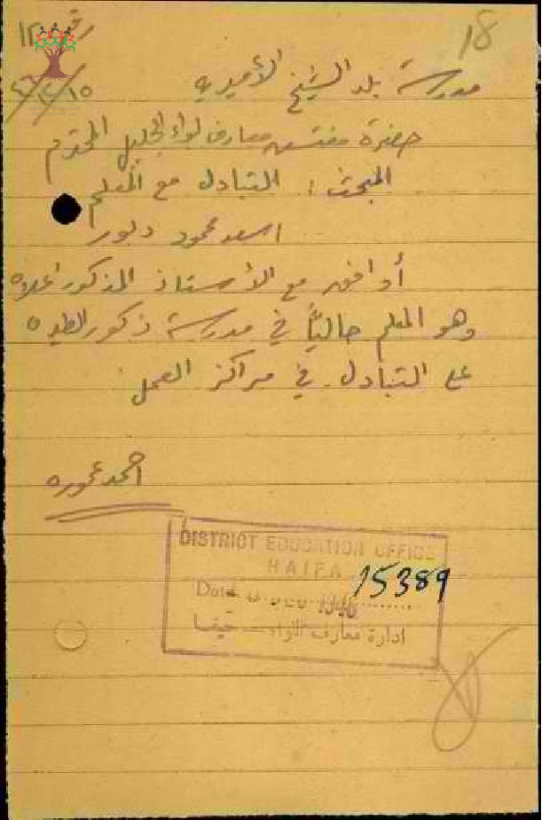 رسالة من المعلم أحمد مصطفى عمورة إلى مفتش المعارف يبحث معه أمر تبادل المركز مع المعلم أسعد محمود دبور