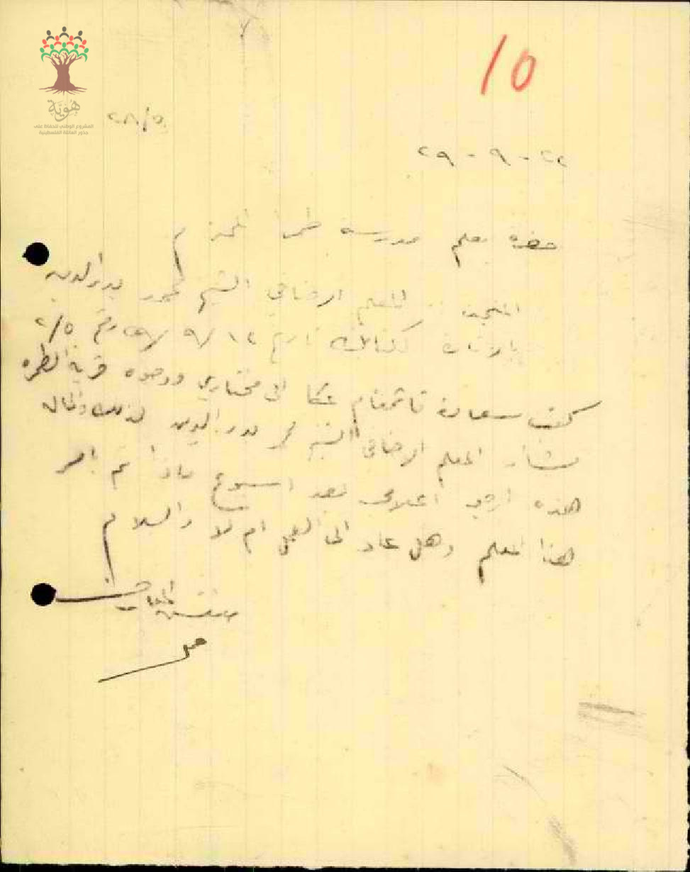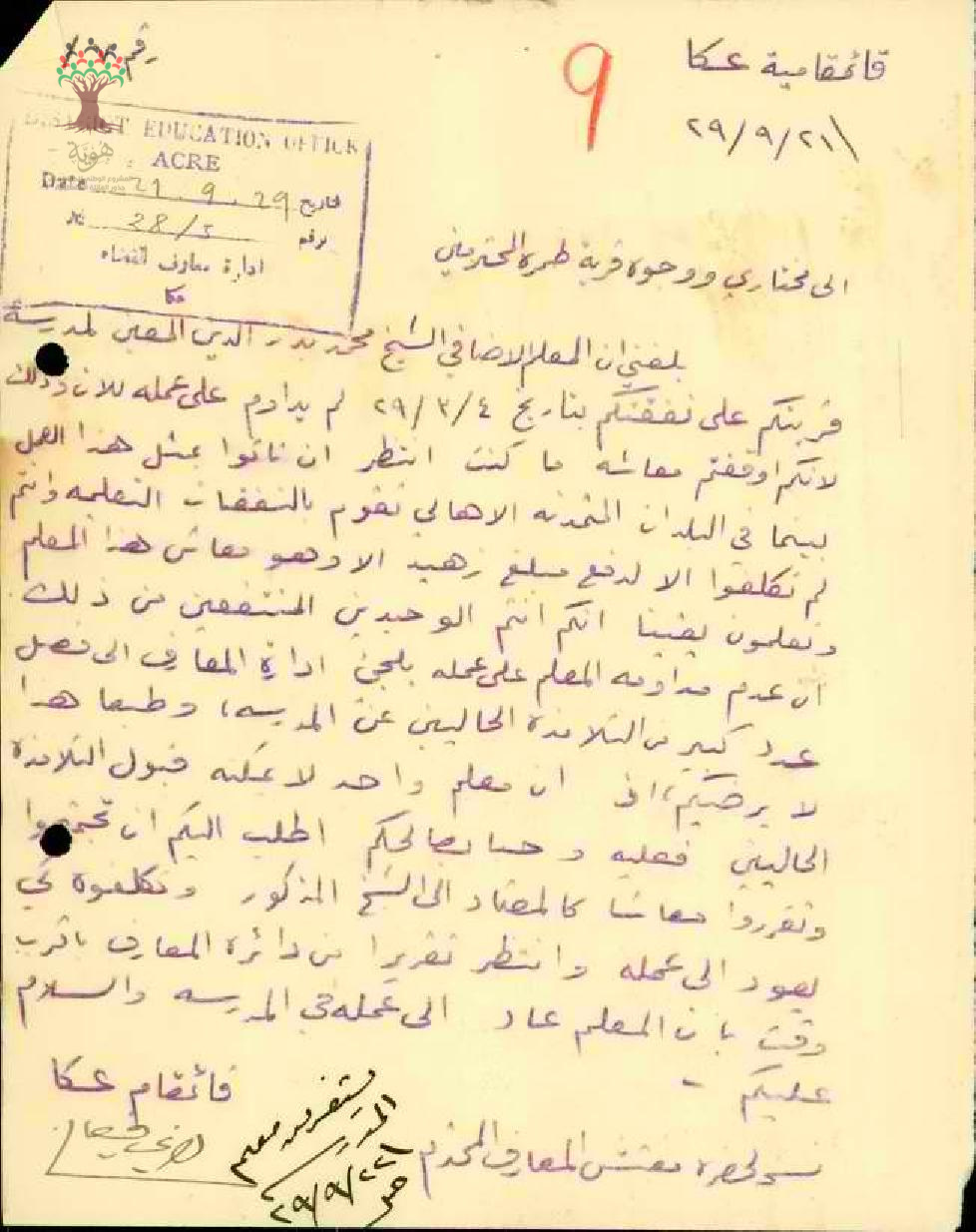 رسالة من قائمقام عكا إلى مختاري ووجوه قرية طمرة يبحث معه عدم دوام المعلم محمد بدر الدين ذياب على عمله