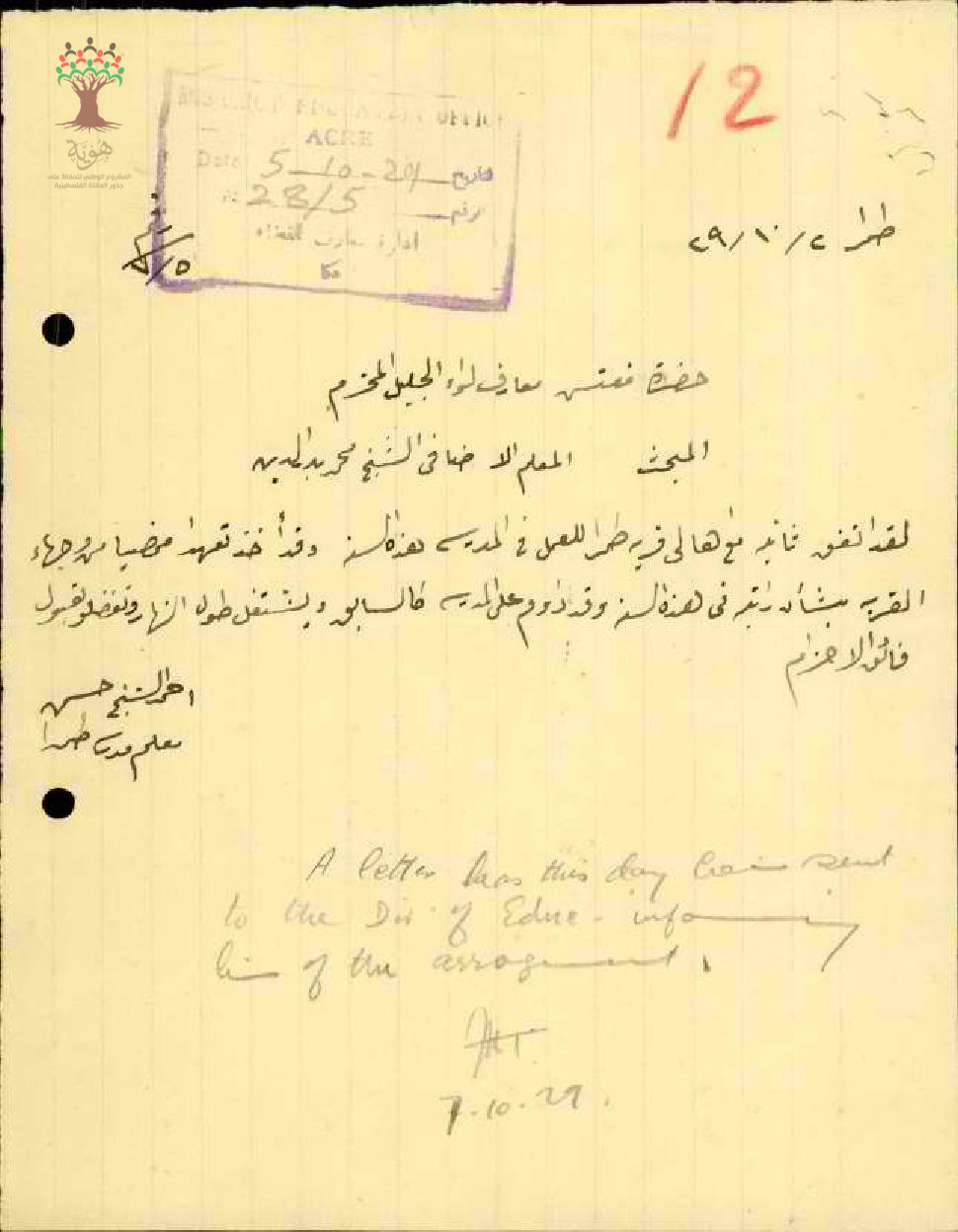 رسالة من المعلم أحمد الشيخ حسن إلى مفتش المعارف يعلمه بعودة المعلم محمد بدر الدين ذياب إلى التعليم في مدرسة طمرة