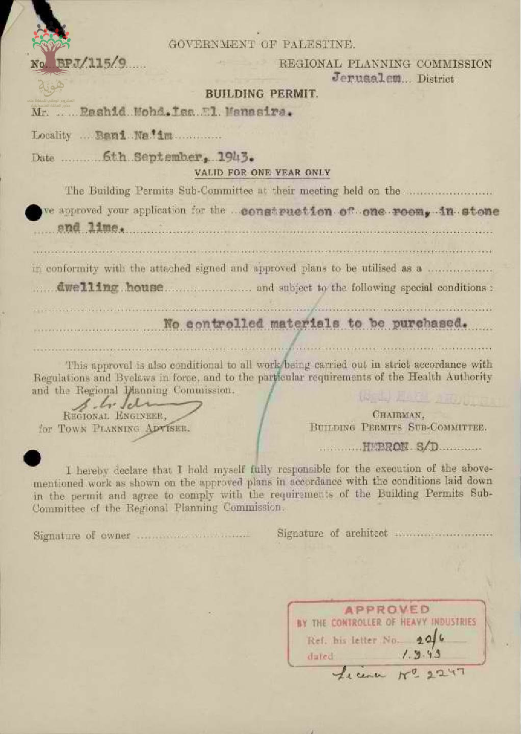رخصة بناء في بني نعيم-رشيد محمد عيسى المناصرة