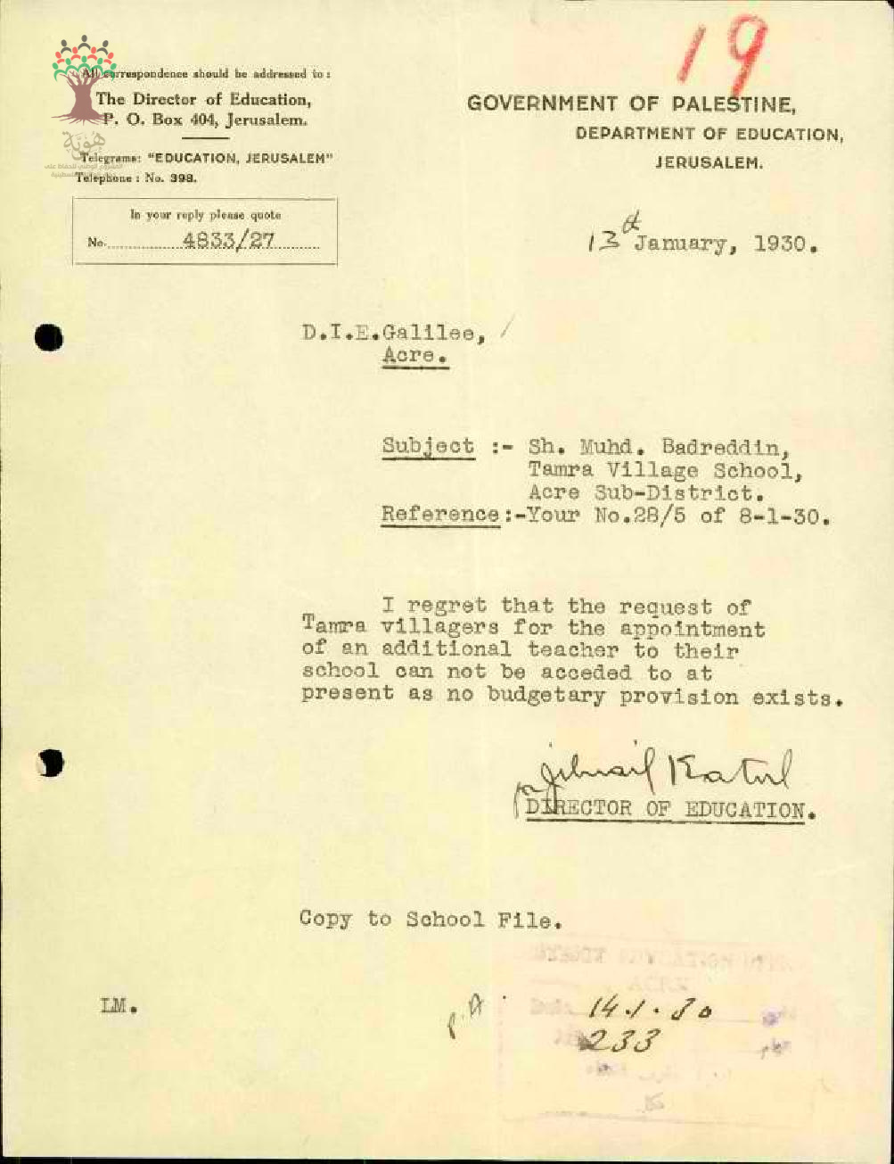 رسالة من مدير المعارف إلى مفتش المعارف يخبره عن أسفه عن قبول طلب المعلم محمد بدر الدين ذياب وجعله معلماً إضافياً