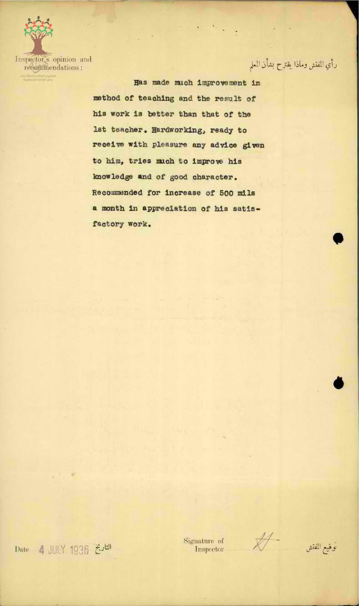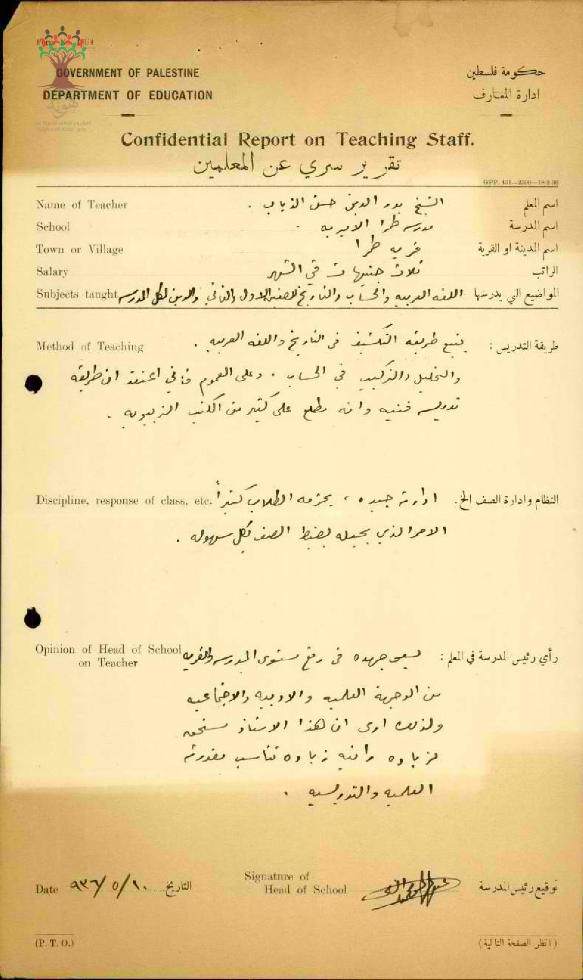تقرير تفصيلي عن أداء المعلم محمد بدر الدين ذياب في مدرسة طمرة سنة1936