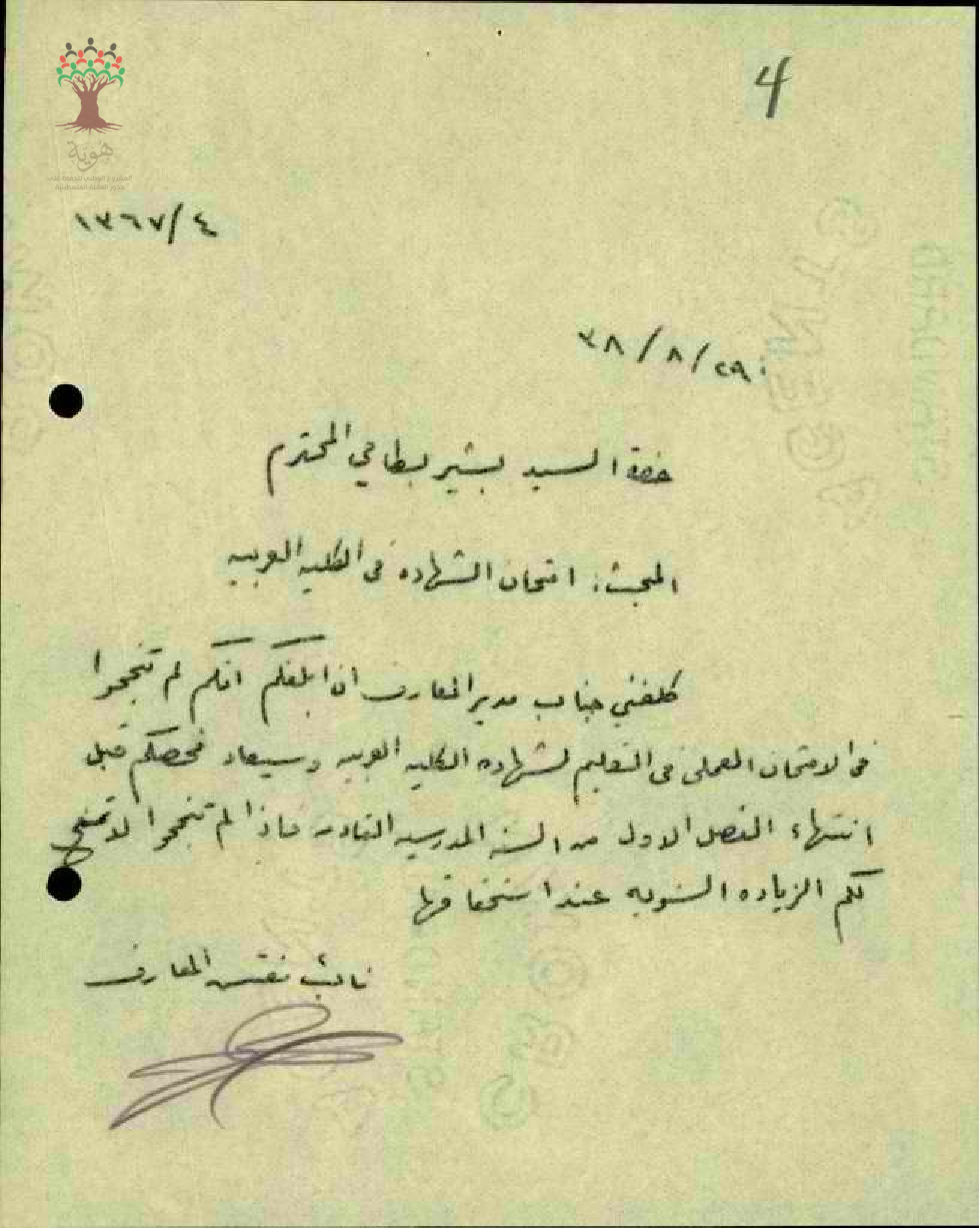 رسالة من نائب مفتش المعارف إلى المعلم بشير البسطامي يخبره بعدم نجاحه في الامتحان العملي في التعليم لشهادة الكلية العربية