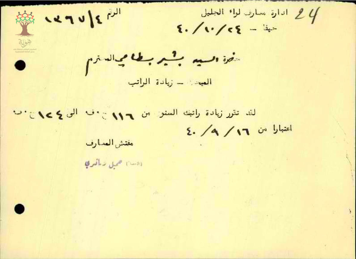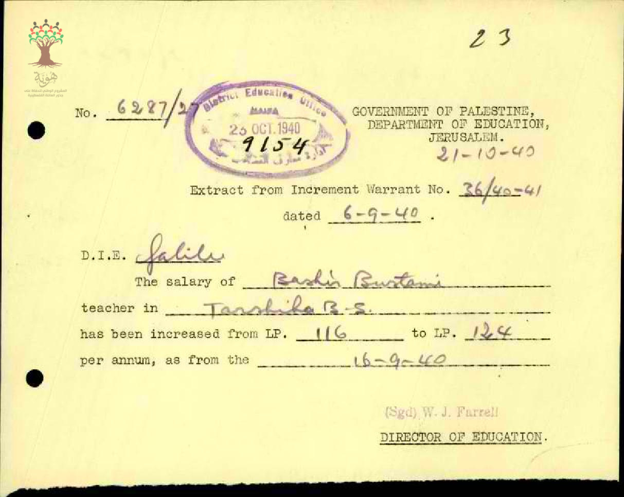 ورقة زيادة راتب للمعلم بشير البسطامي سنة 1940