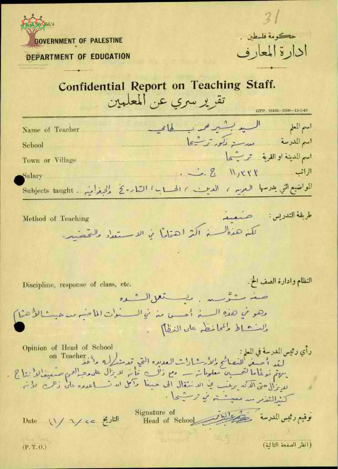 تقرير تفصيلي عن أداء المعلم بشير البسطامي في مدرسة ترشيحا سنة 1941