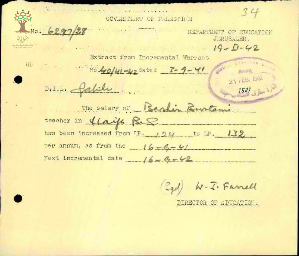رسالة من مفتش المعارف إلى المعلم بشير البسطامي يخبره بزيادة راتبه السنوي