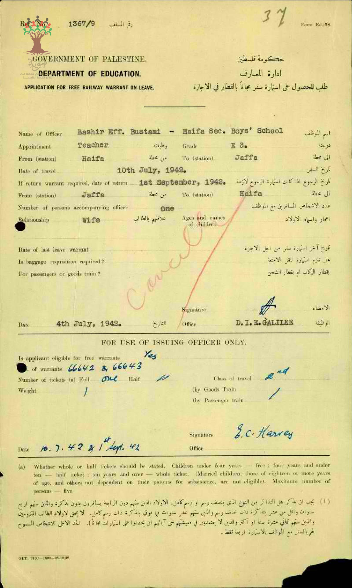 استمارة سفر مقدمة إلى المعلم بشير البسطامي / حيفا