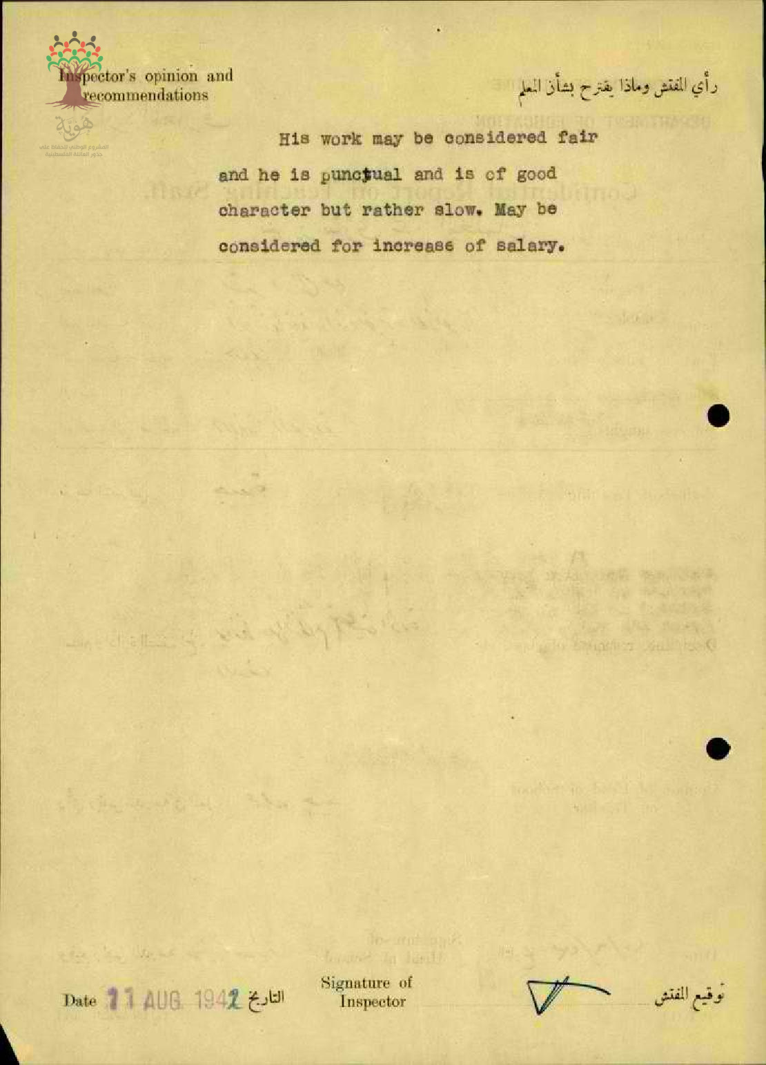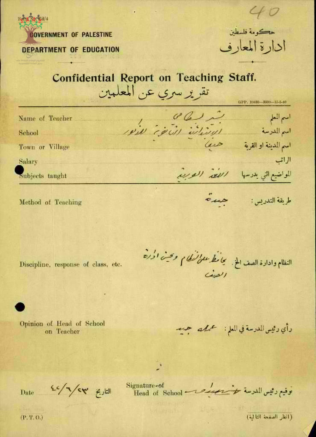 تقرير تفصيلي عن أداء المعلم بشير البسطامي في مدرسة حيفا سنة 1942