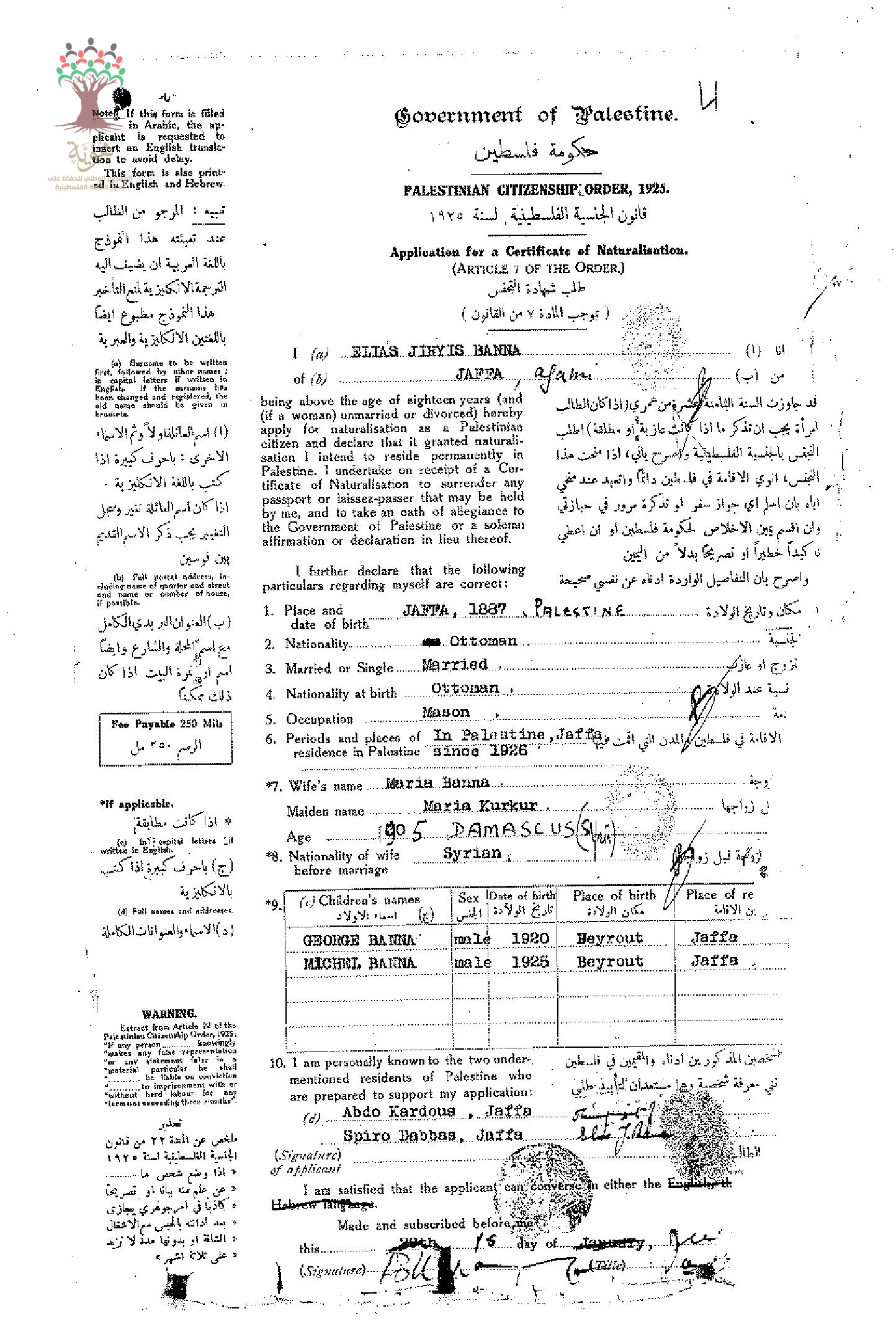 شهادة الجنسية الفلسطينية ل الياس البنا