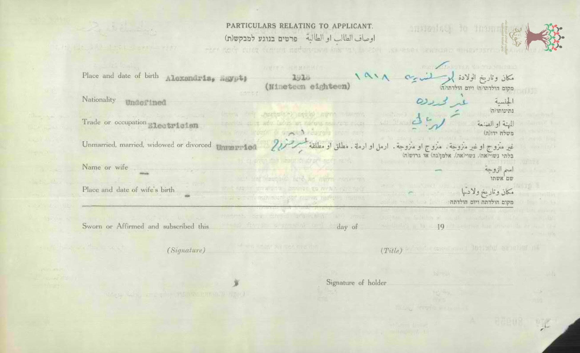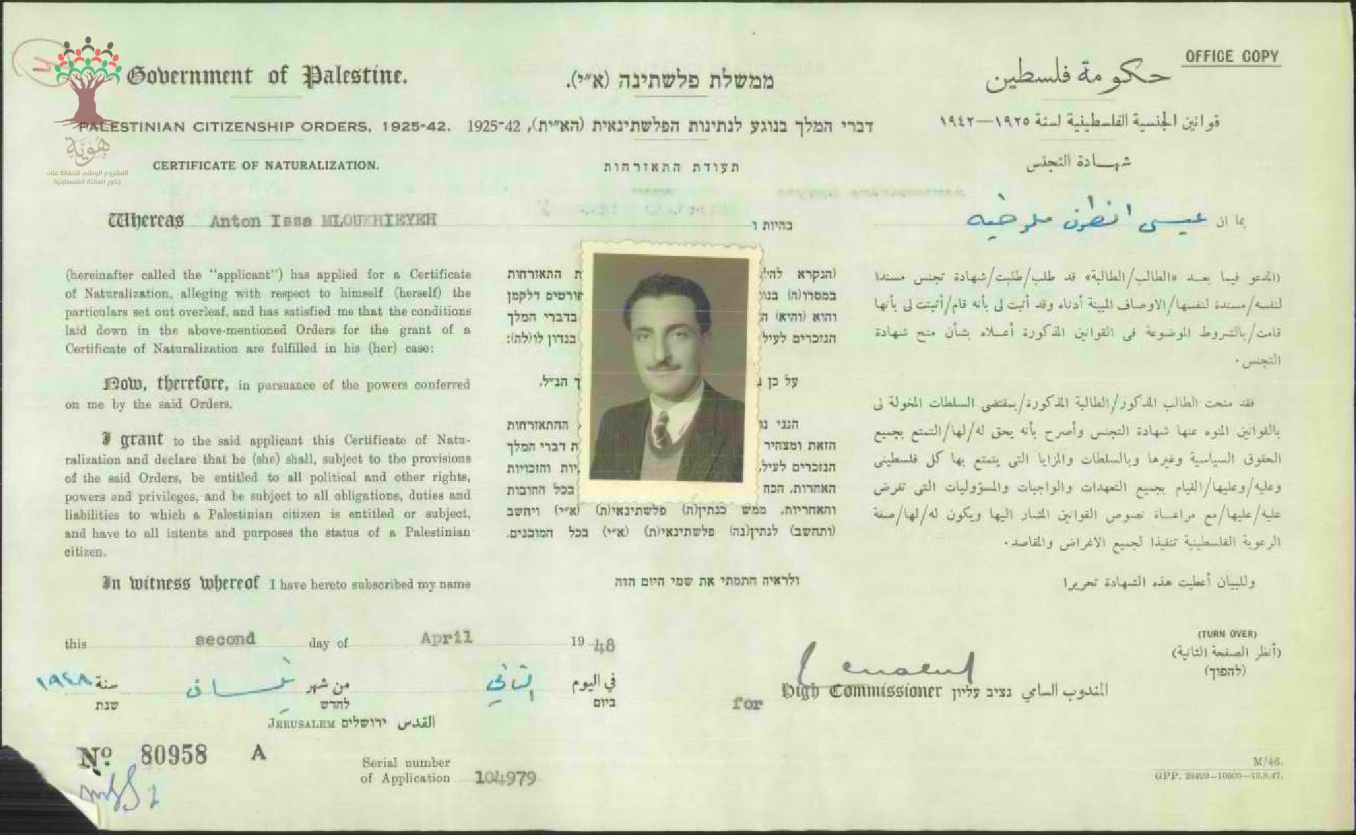 شهادة الجنسية الفلسطينية ل عيسى انطوان ملوخية