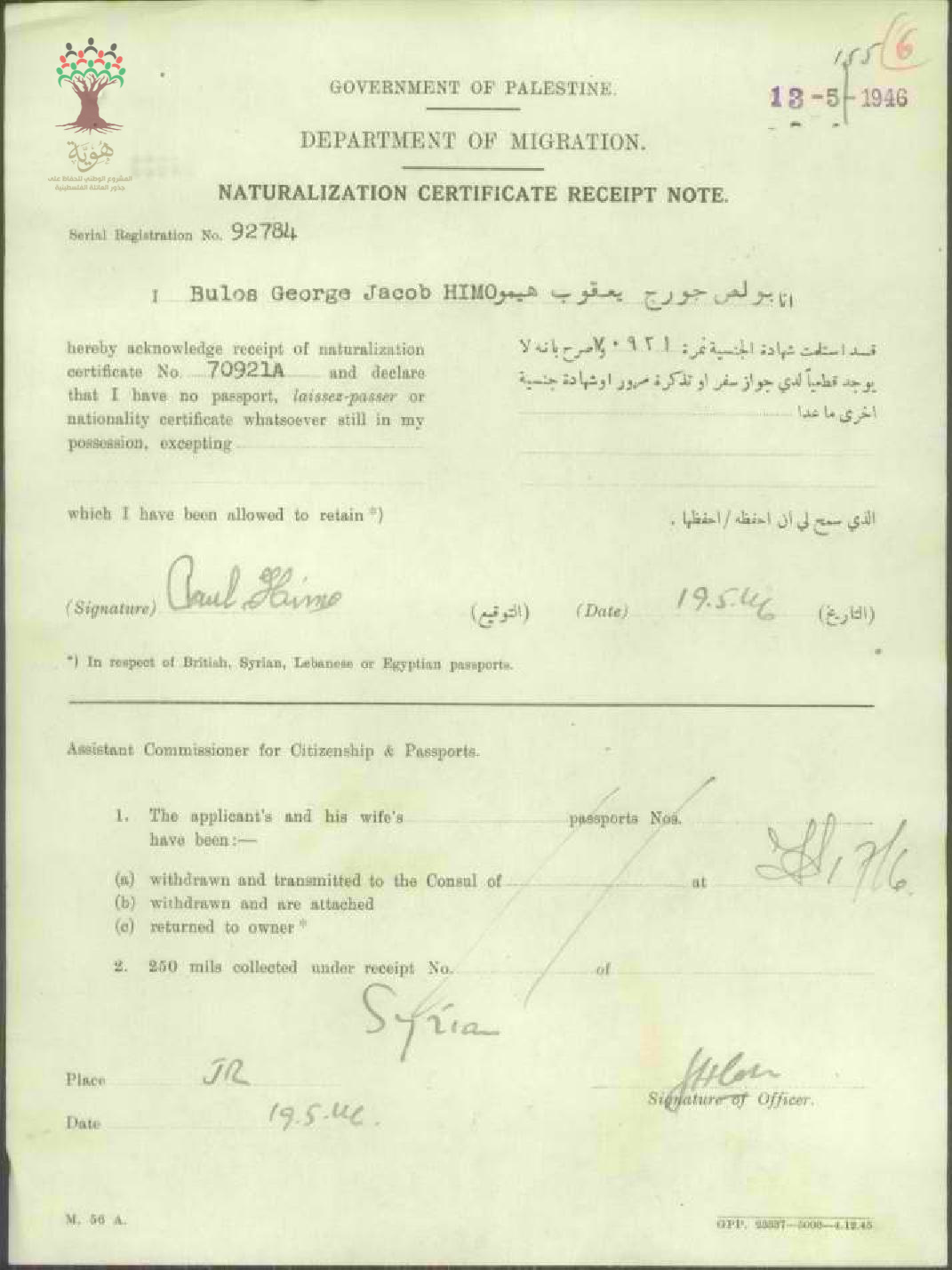 إيصال موقع من بولص جورج هيمو باستلام شهادة الجنسية الفلسطينية