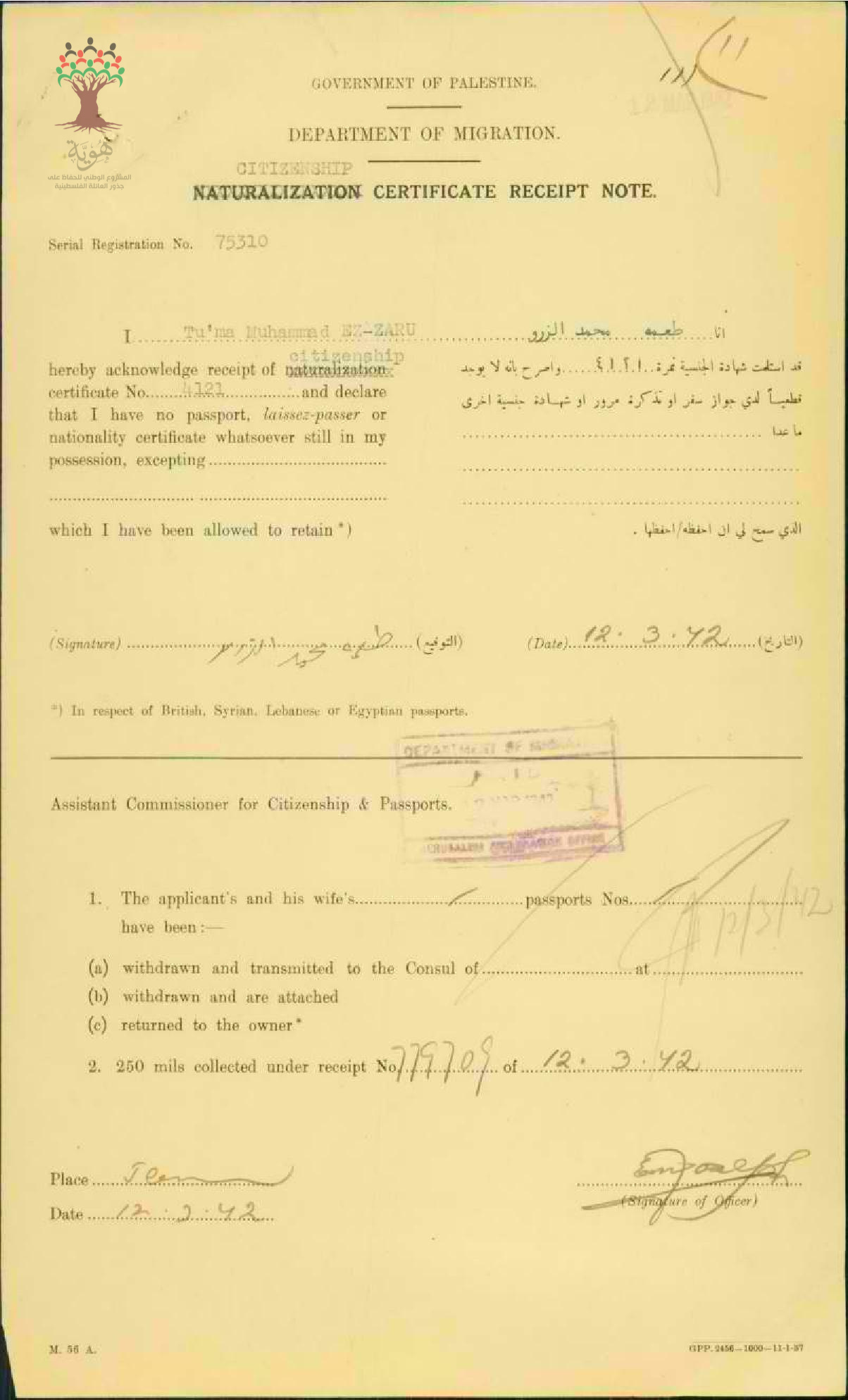 إيصال موقع من طعمة محمد الزرو باستلام شهادة الجنسية الفلسطينية