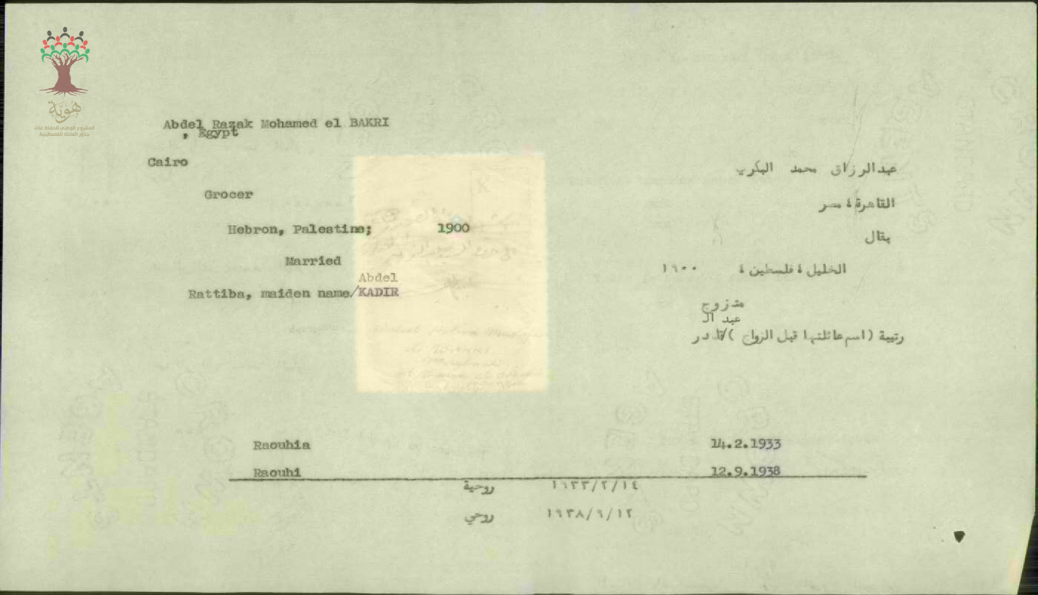 ورقة بيانات عبد الرازق البكري المرفقة بطلب الجنسية وزوجته رتيبة نادر