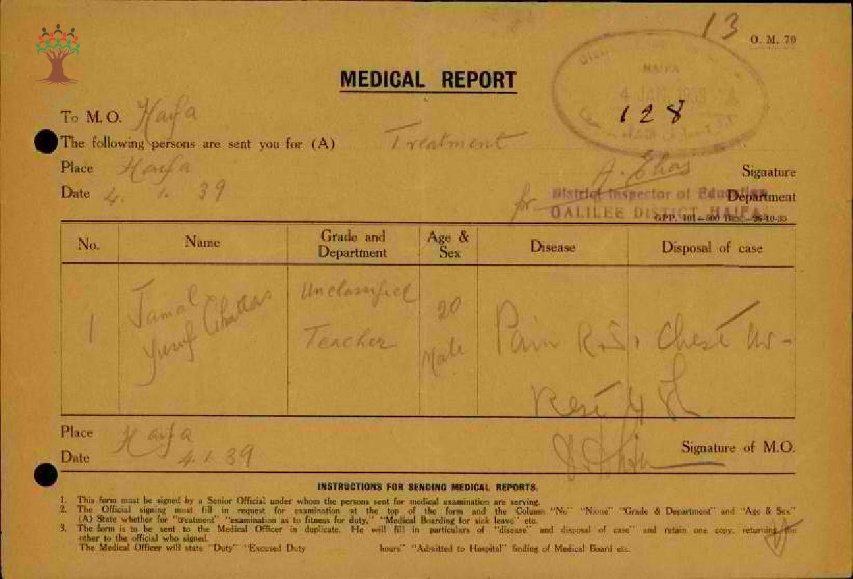 تقرير طبي للمعلم جمال غطاس في مدرسة دالية الكرمل سنة 1939