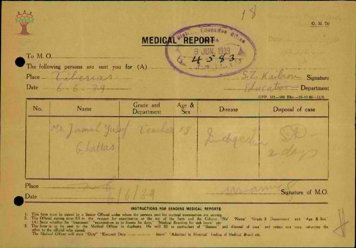 تقرير طبي للمعلم جمال غطاس سنة 1939