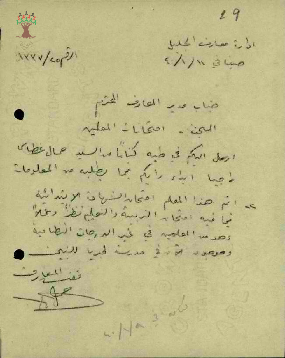 رسالة من مفتش المعارف إلى مدير المعارف يبحث معه أمر اتمام المعلم جمال غطاس فحوص الشهادة الابتدائية