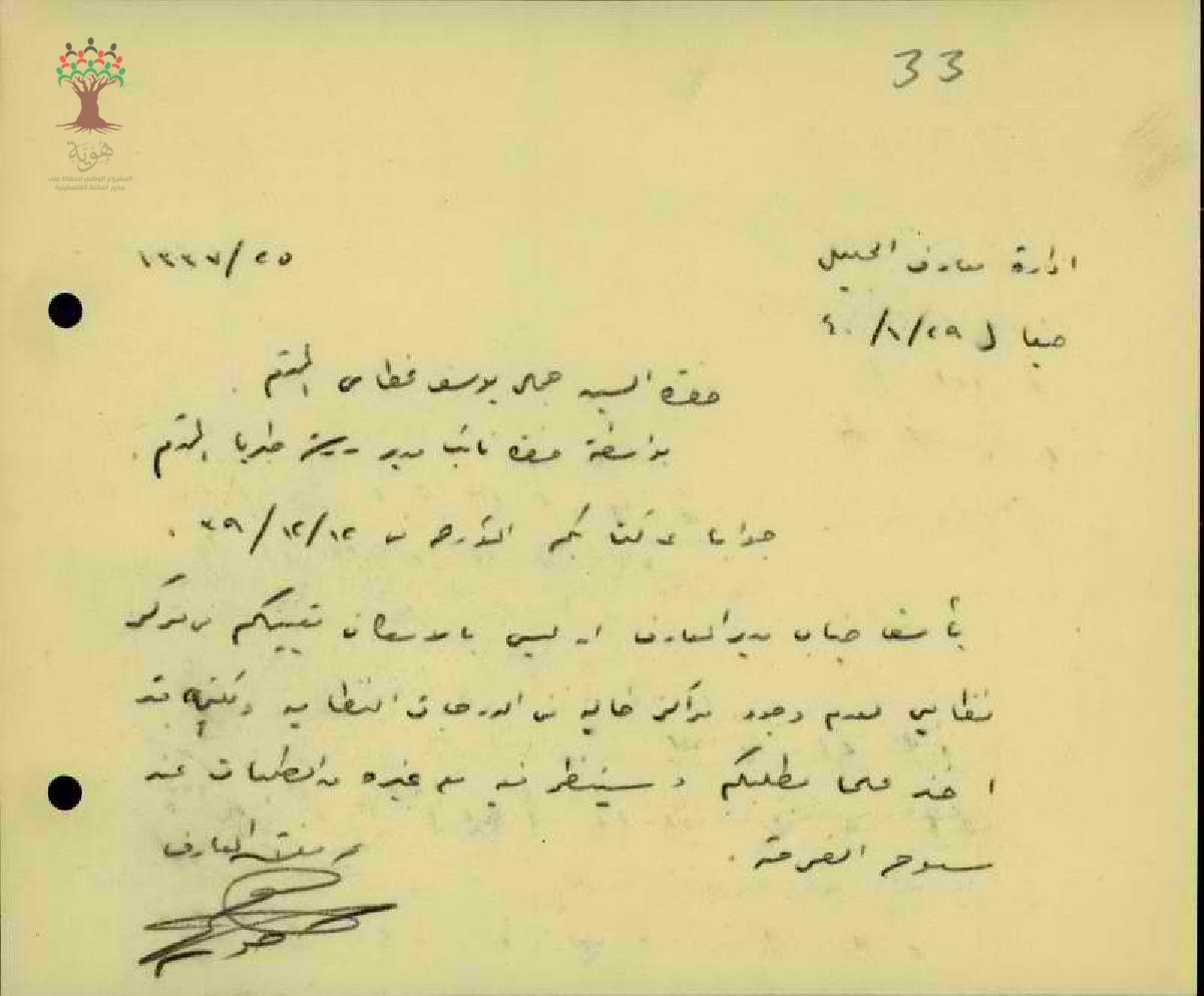 رسالة من مفتش المعارف إلى المعلم جمال غطاس يخبره بعدم امكانية تعيينه في مركز نظامي