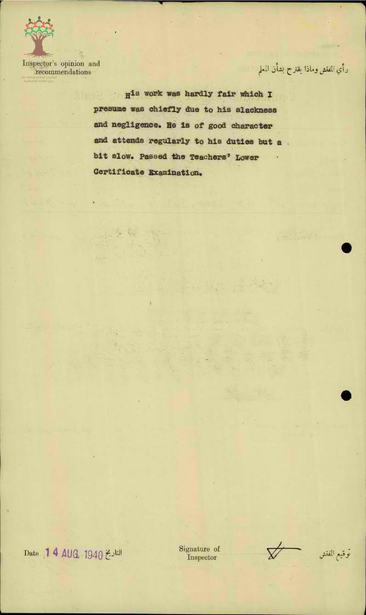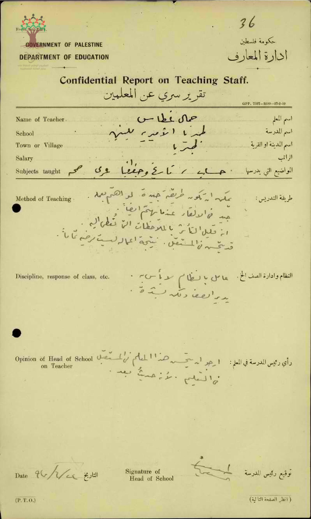 تقرير تفصيلي عن أداء المعلم جمال غطاس في مدرسة طبريا سنة 1940
