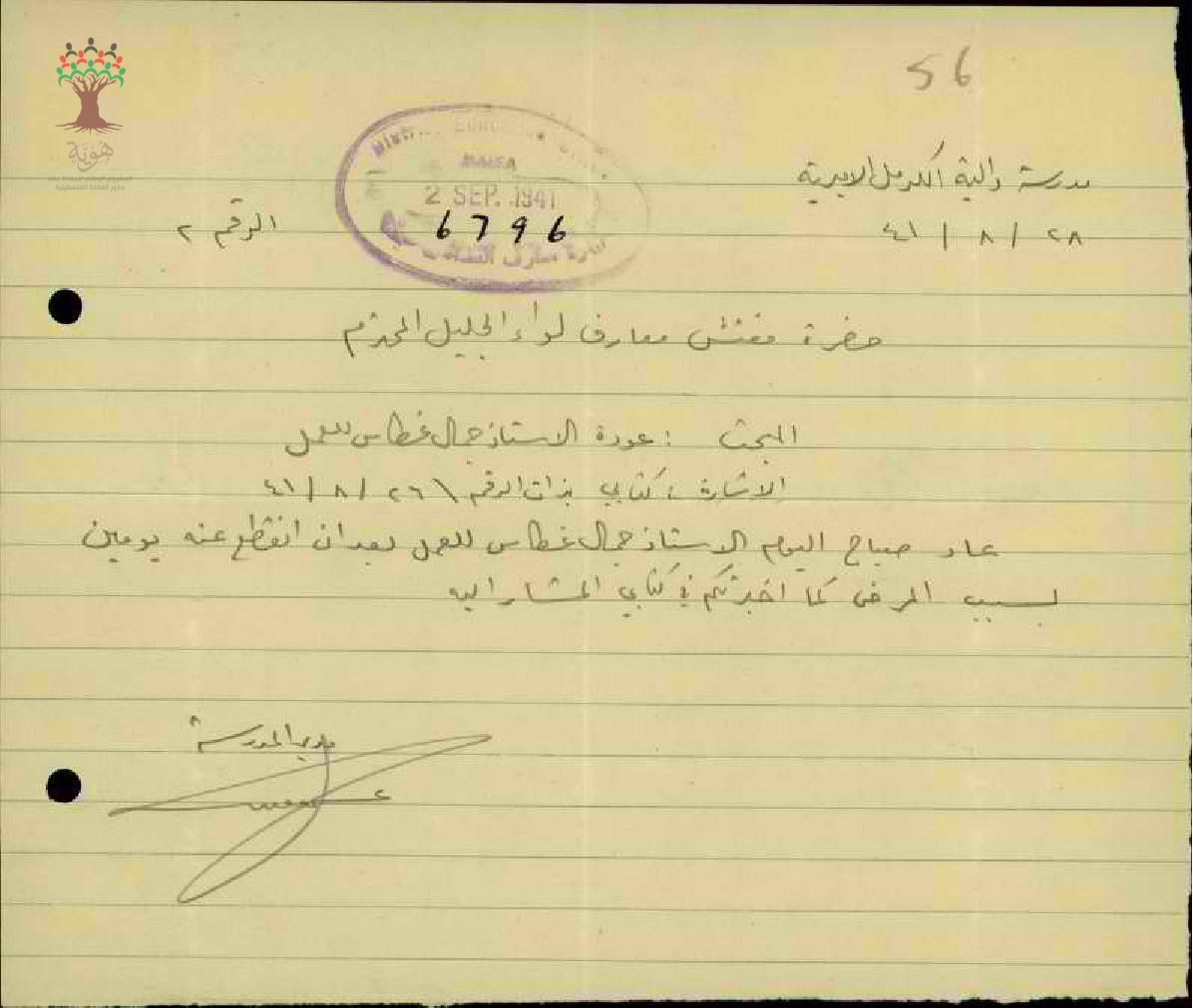 رسالة من مدير مدرسة دالية الكرمل إلى مفتش المعارف يخبره بعودة المعلم جمال غطاس إلى المدرسة
