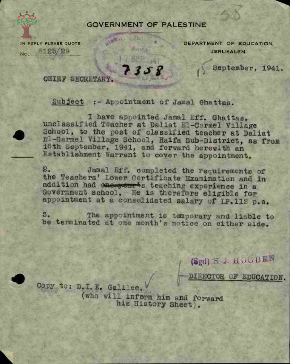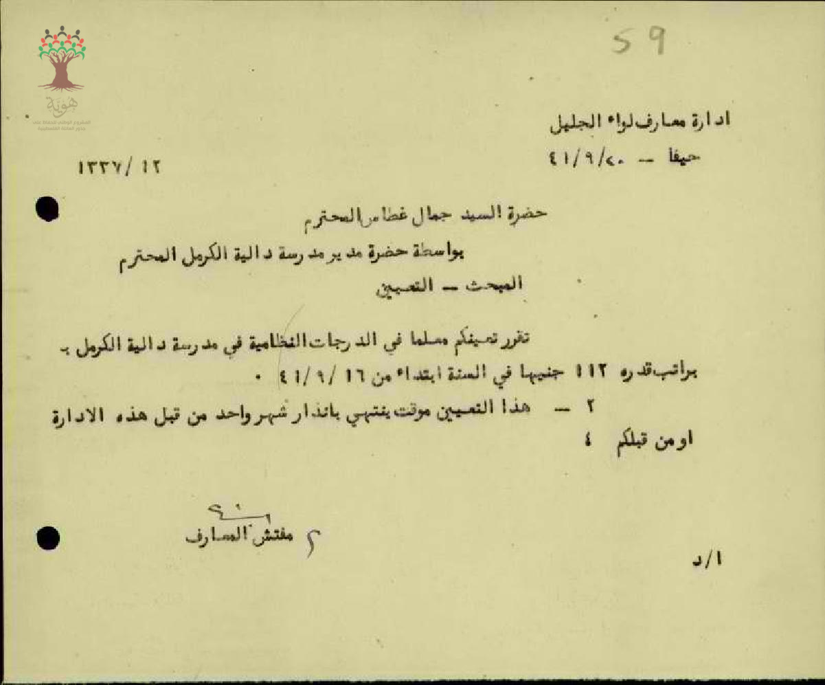 قرار تعيين المعلم جمال غطاس معلماً نظامياً في مدرسة دالية الكرمل