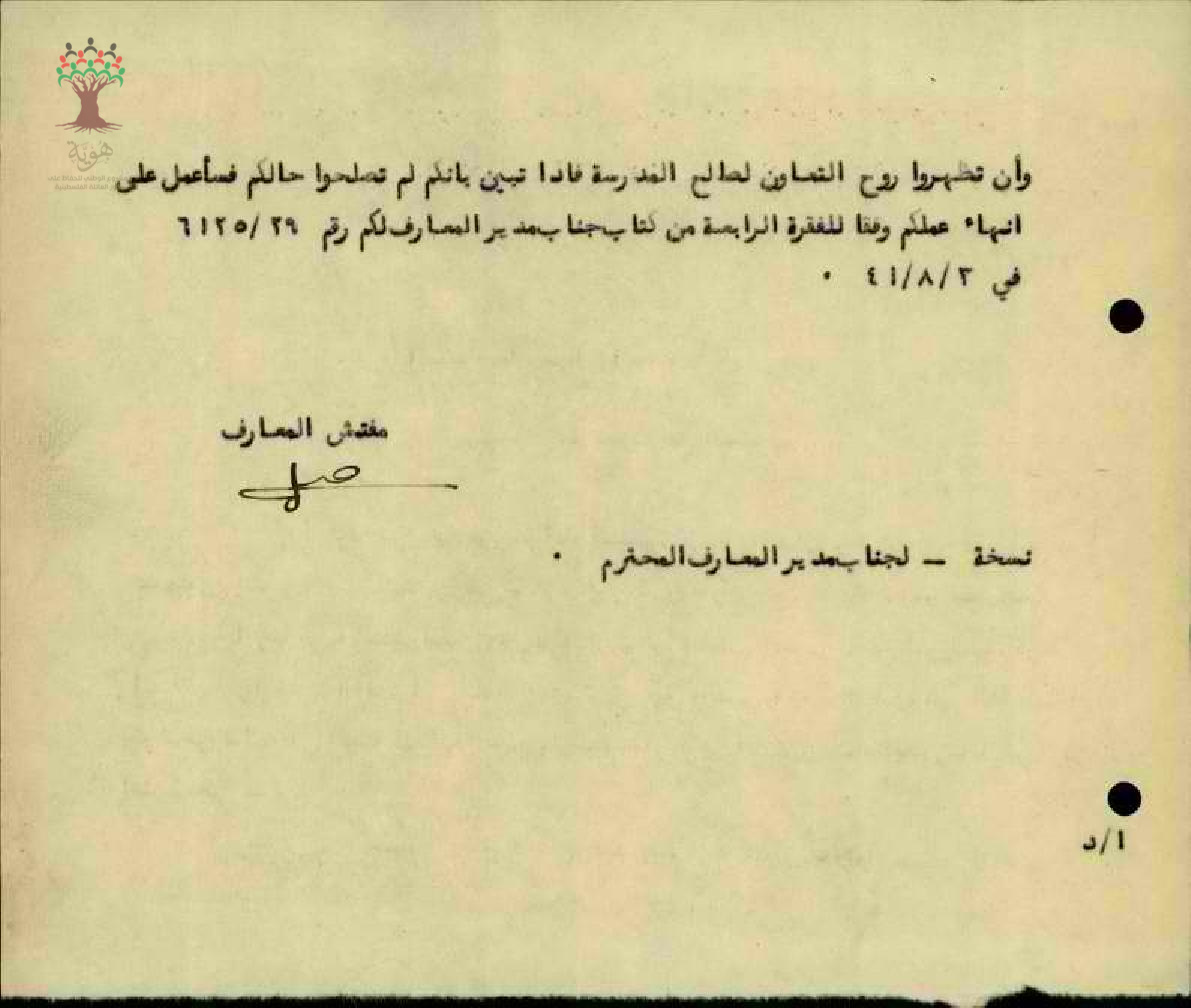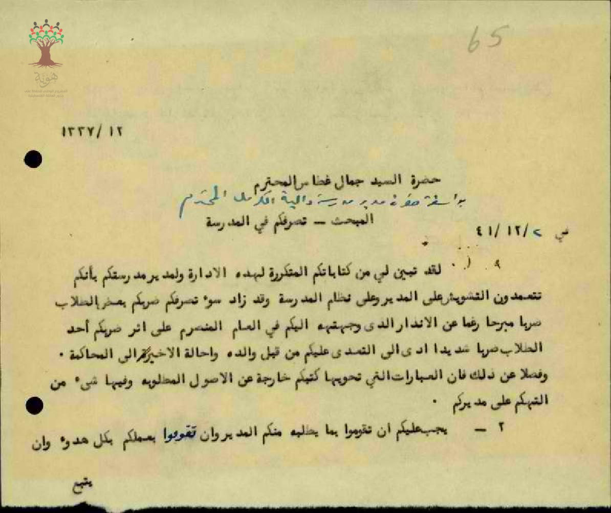 رسالة من مفتش المعارف إلى المعلم جمال غطاس يبحث معه تصرفه في مدرسة دالية الكرمل
